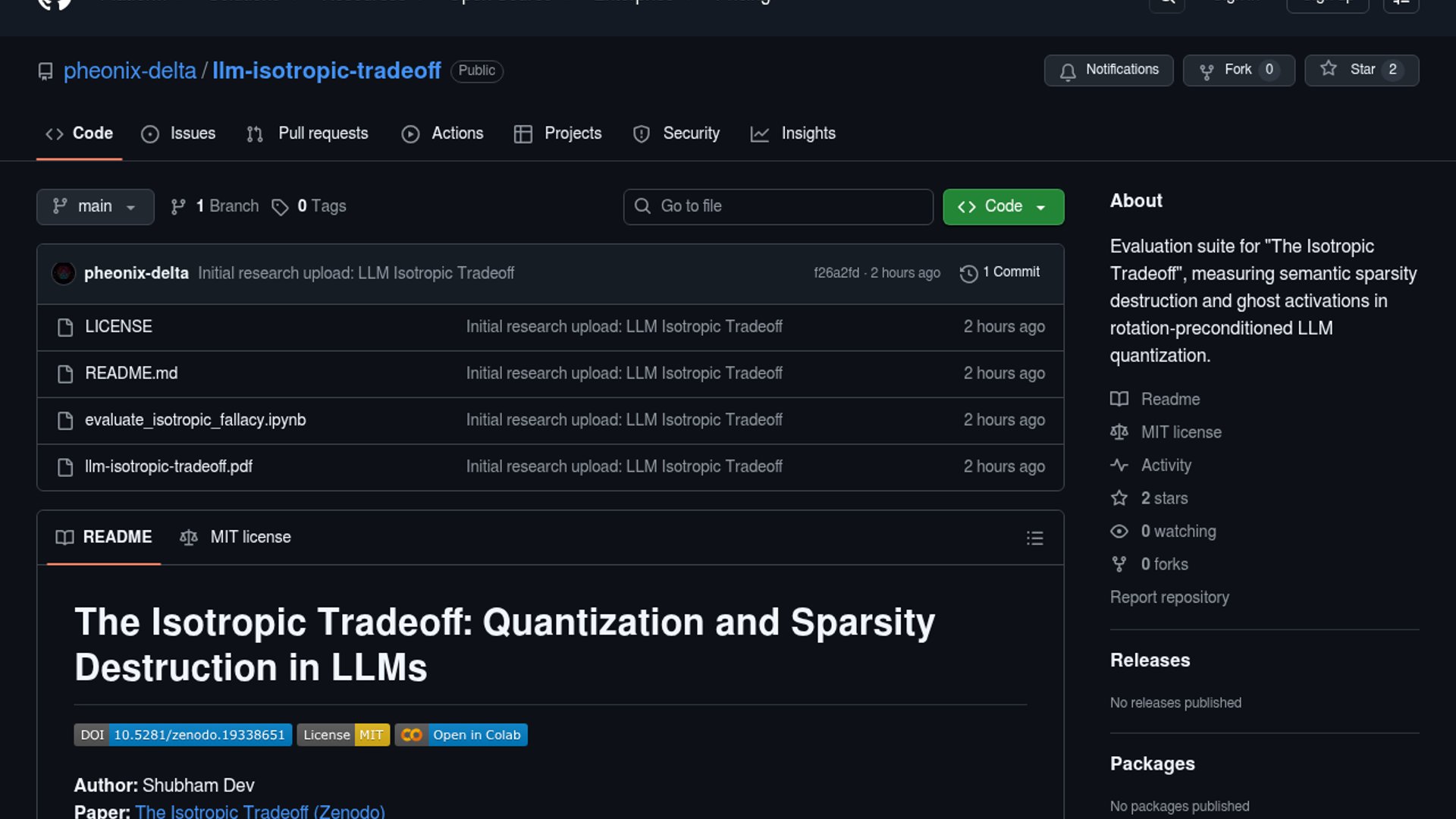 The Isotropic Tradeoff is a draft paper and evaluation suite that argues rotation-based LLM quantization improves outlier reconstruction while creating hundreds of thousands of ghost activations. Its Qwen2.5-1.5B 3-bit runs show better cosine similarity and lower outlier MSE, but a worse low-activation noise floor.