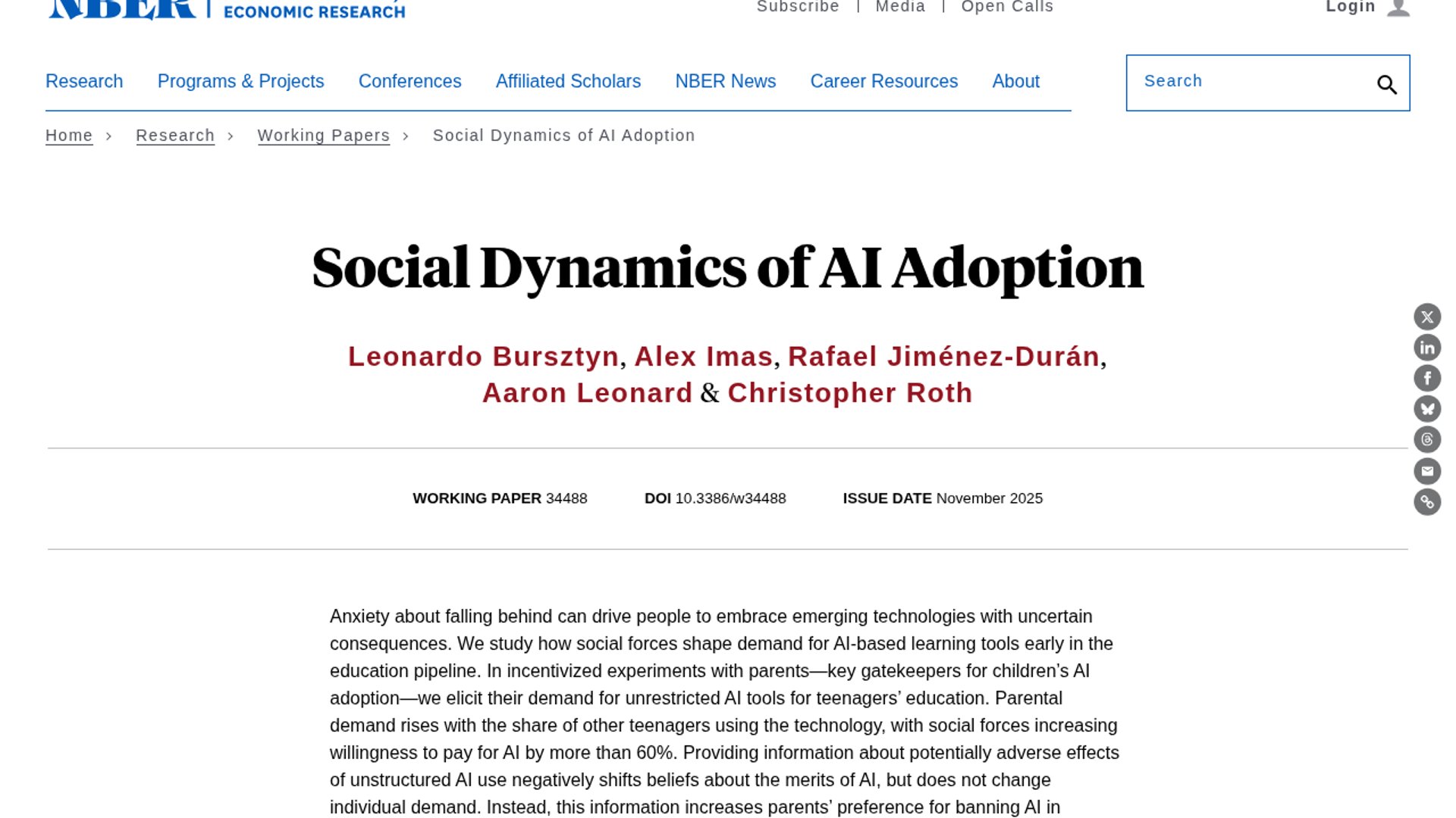 A Chicago Booth/NBER working paper finds that parents are more worried about their kids missing out on AI than about AI’s potential harms. In experiments with roughly 2,000 parents, willingness to pay for a teen AI subscription rose as peer adoption increased, even after respondents learned about possible cognitive downsides.