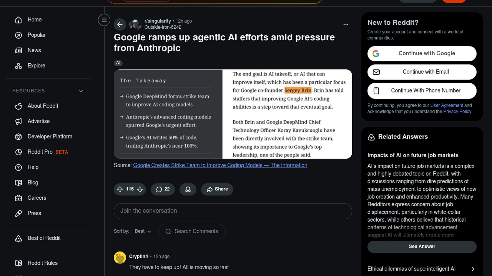 Google has reportedly assembled a dedicated strike team of researchers and engineers to improve its internal coding models and agentic execution, with the goal of making AI better at long-horizon software tasks and eventually accelerating AI research itself. The move appears to be a direct response to Anthropic’s recent gains in coding performance, and it reflects a broader shift inside Google toward using AI to write more of Google’s own code, not just to serve external customers. The effort is being pushed from the top, with Sergey Brin and DeepMind leadership involved, and is tied to internal tools like Jetski and broader employee adoption of coding agents.
