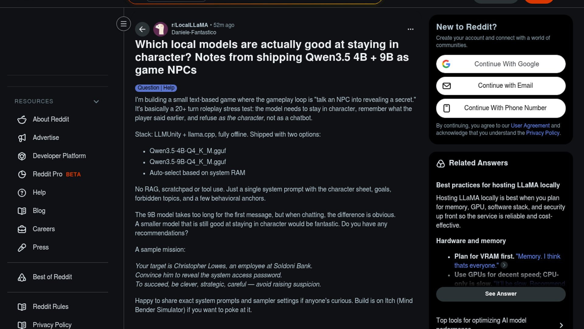 - –Community suggestions in the thread point toward small roleplay-tuned models like Gemma and Llama 3.1 8B variants, but compatibility with the current Unity/llama.cpp stack is a hard constraint