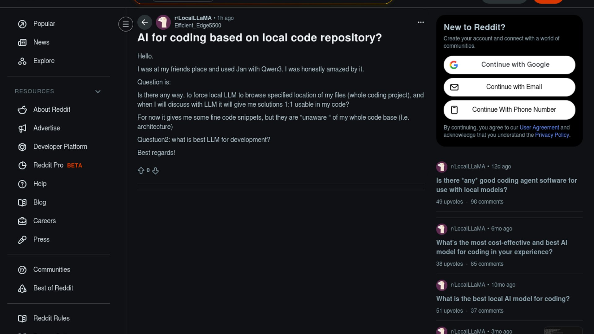 A Reddit post in r/LocalLLaMA says using Jan with Qwen3 was impressive, then asks the bigger question many local-model users now have: how do you make a local LLM understand an entire codebase instead of generating isolated snippets. The discussion is less about a new Jan release than about the growing expectation that local AI tools should support project-wide code awareness and architecture-sensitive edits.