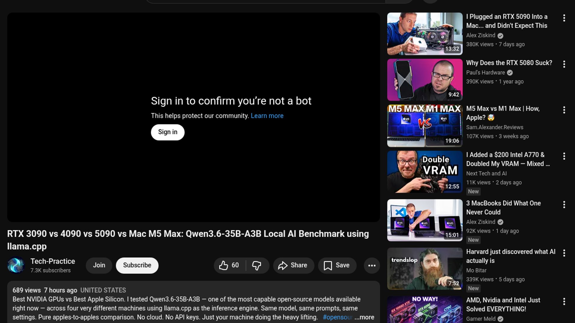 - –Mac M5 Max is restricted by memory bandwidth for raw speed (~95 t/s) but can natively host 1M token context windows that would require 4+ RTX 3090s to fit in VRAM.