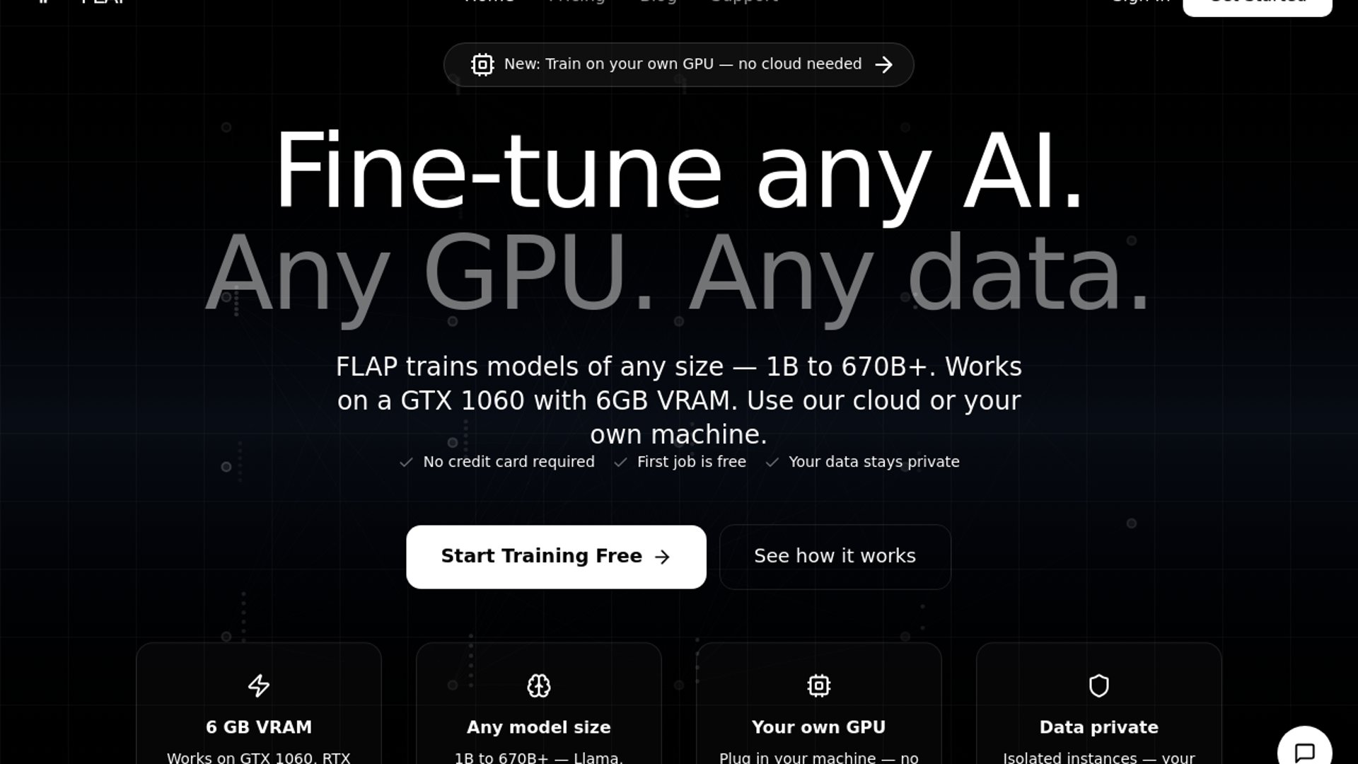 FLAP AI is a local LLM fine-tuning platform that says it can train models on as little as 6GB of VRAM, with no cloud infrastructure and no data leaving your machine. The Reddit post leans into a GTX 1060 6GB demo to make the pitch feel almost implausibly accessible.