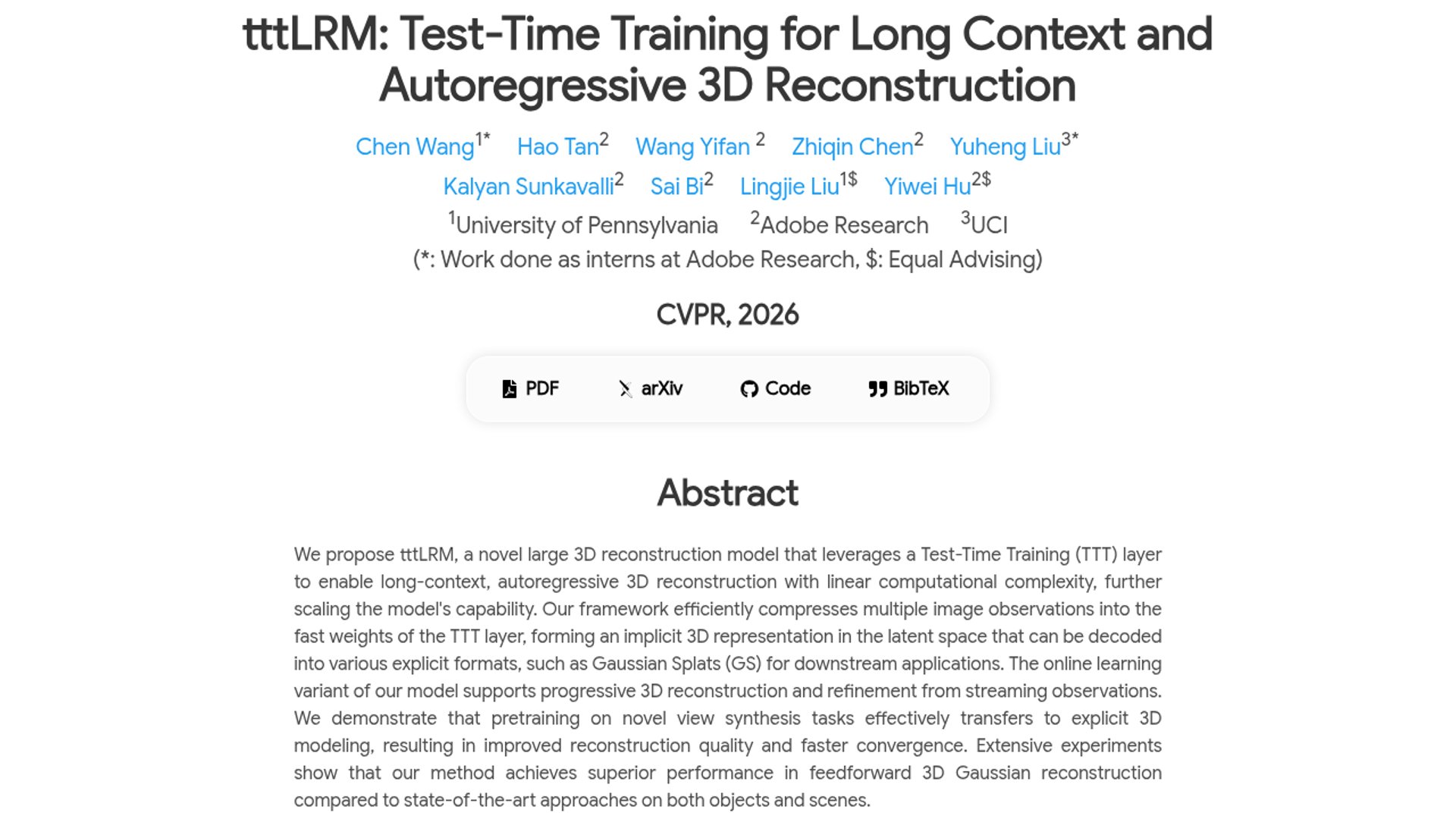 tttLRM is a CVPR 2026 paper and project from researchers at UPenn, Adobe Research, and UCI that uses a test-time training layer to handle long-context autoregressive 3D reconstruction with linear complexity. The system compresses many posed images into fast weights, decodes them into explicit 3D formats like Gaussian splats, and supports progressive reconstruction from streaming observations.