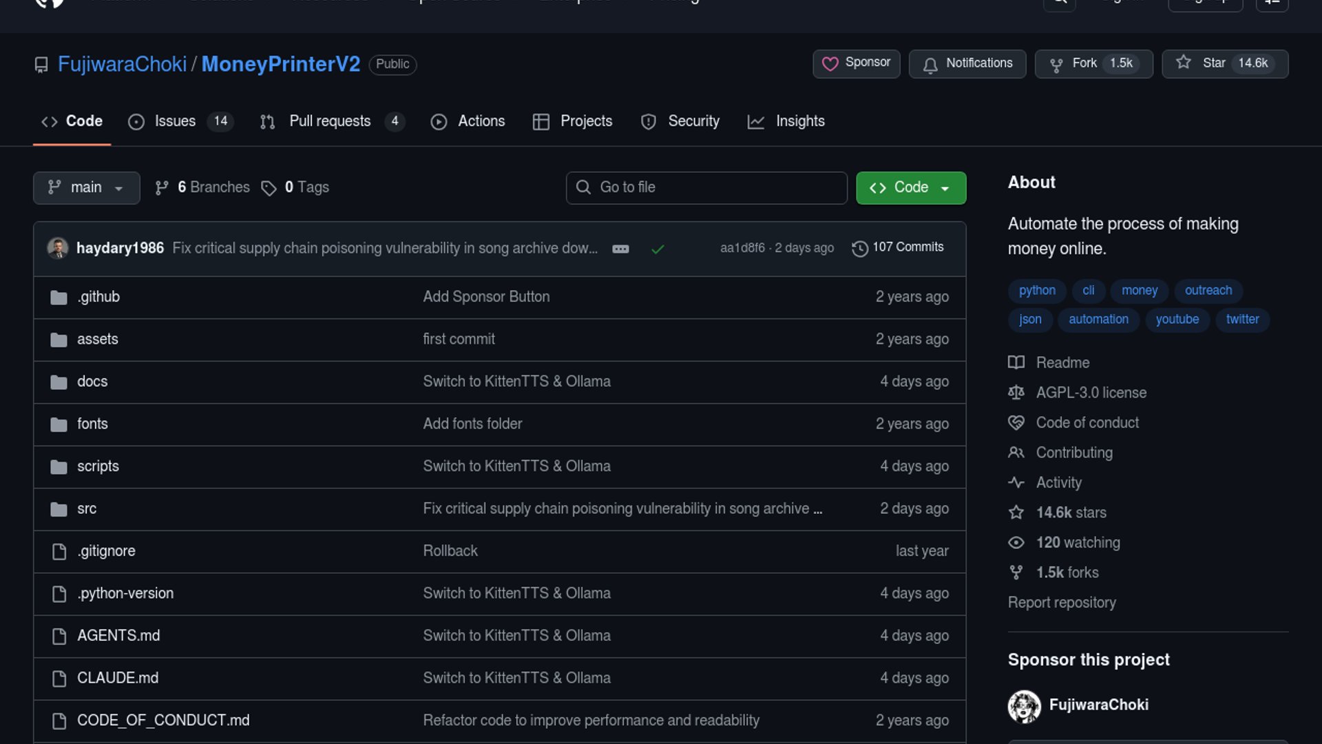 MoneyPrinterV2, an AGPL-licensed Python automation project, is gaining major traction on GitHub with 14.5k+ stars and strong daily growth. The repo packages social automation workflows like YouTube Shorts generation, Twitter posting, affiliate marketing, and outreach into a modular scriptable toolkit.