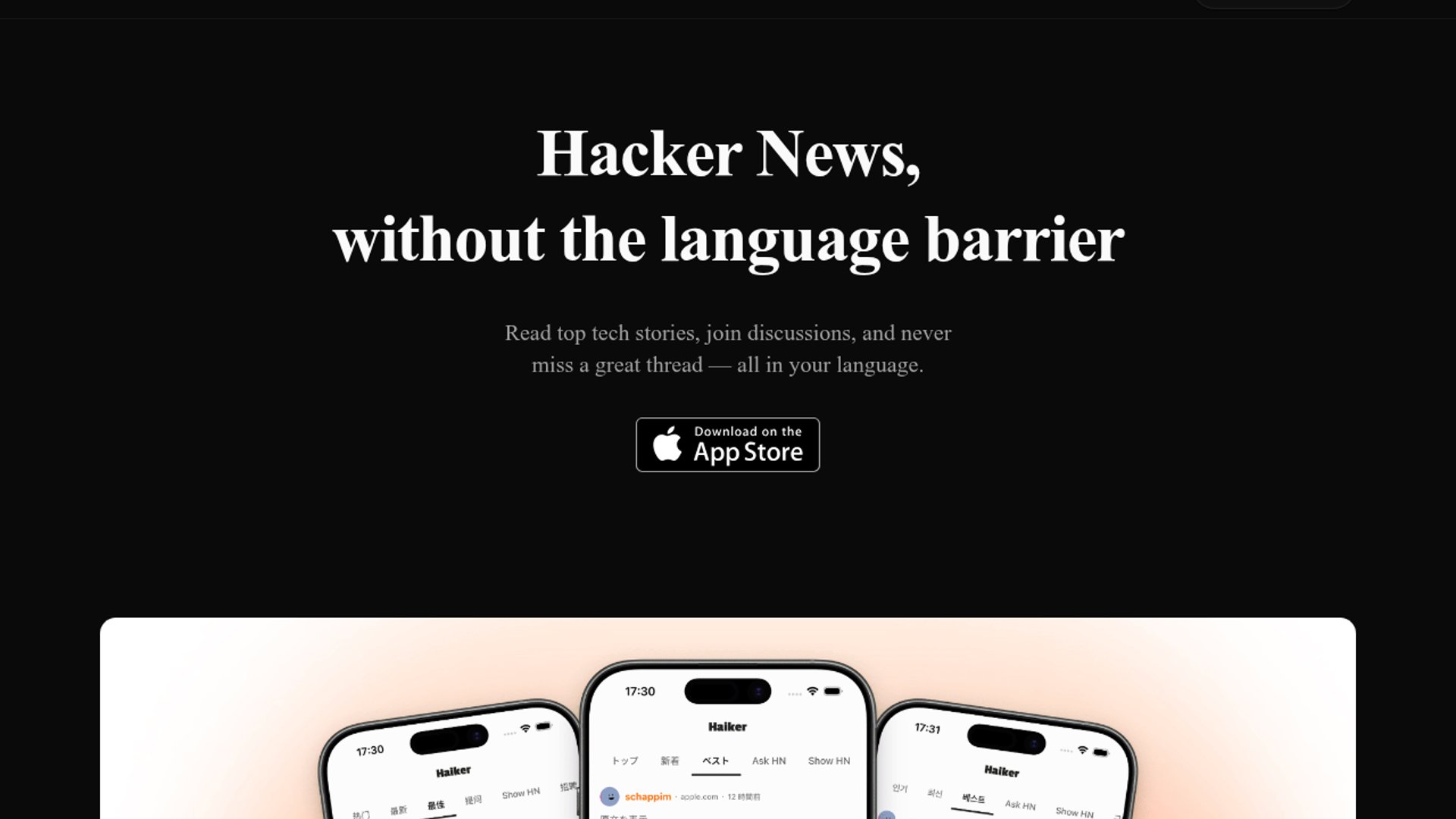 Haiker is a Hacker News client built for non-native English speakers, automatically translating posts and comments into the reader's language. Replies translate back to English, so users can participate without constantly switching contexts.