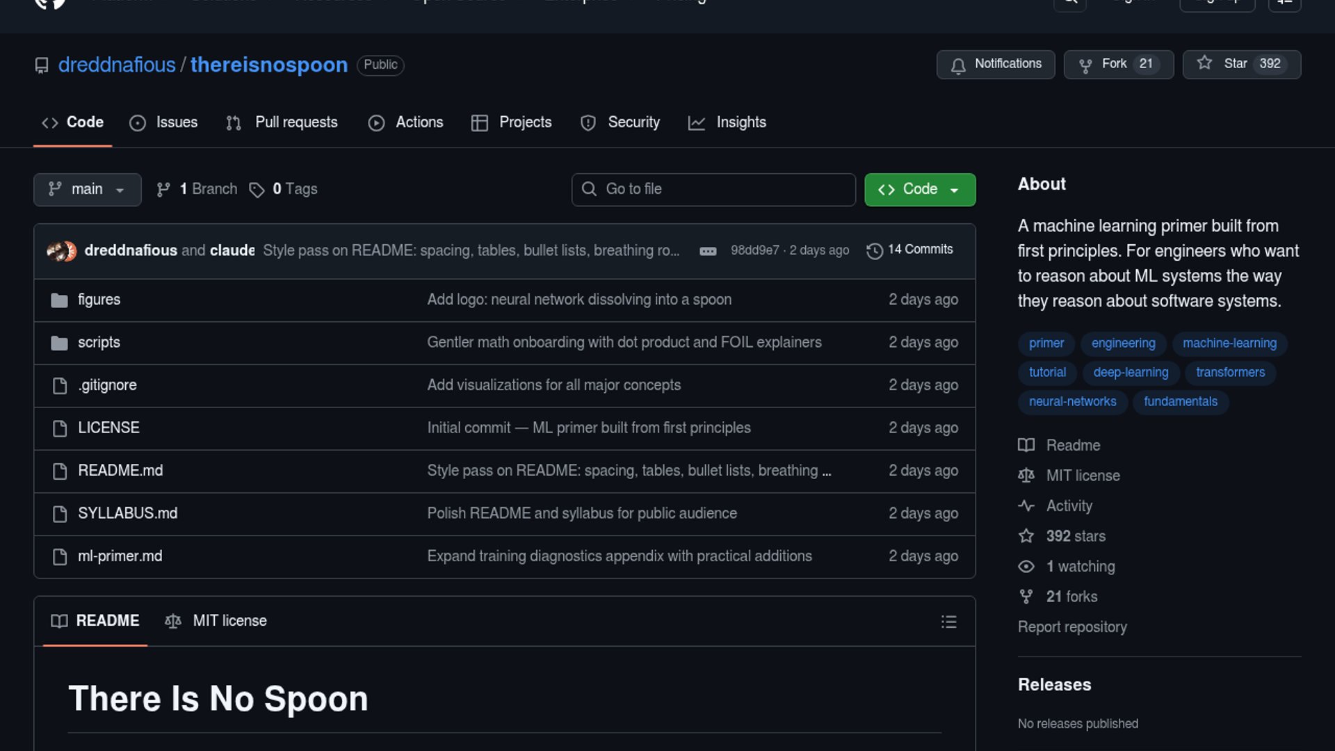 There Is No Spoon is an open-source machine learning primer built from first principles for engineers who want to reason about ML systems like software systems. It leans on analogies, visualizations, and a single markdown-based curriculum instead of a conventional textbook format.