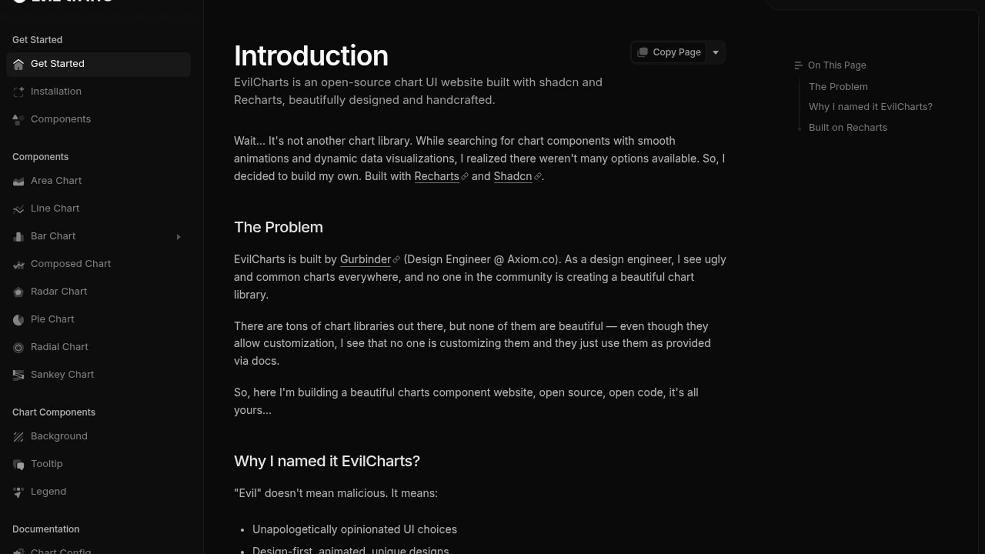EvilCharts is an open-source chart UI website built with shadcn/ui and Recharts, aimed at making charts feel more handcrafted and visually distinct. It packages polished, opinionated chart components for React and Next.js teams that want better-looking data viz without designing everything from scratch.