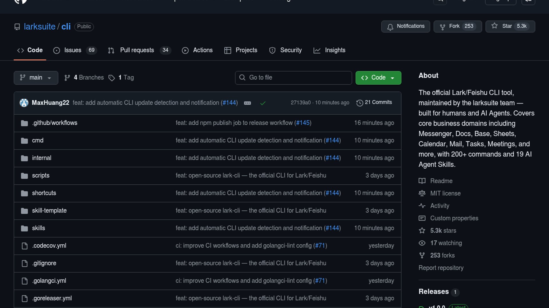 lark-cli is the official Lark/Feishu command-line tool maintained by the larksuite team. It is designed for both humans and AI agents, with coverage across messaging, docs, base, sheets, calendar, mail, tasks, meetings, drive, wiki, contacts, and more. The repo emphasizes an agent-native workflow with structured skills, concise commands, smart defaults, and a quick start path that goes from install to authenticated use in a few steps.