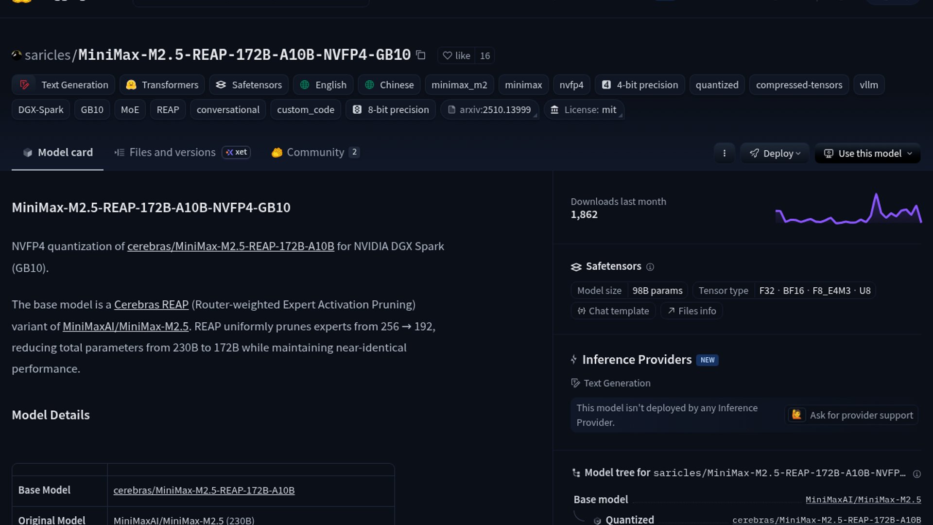 - –Base model lineage is solid: MiniMax-M2.5 -> Cerebras REAP 172B -> NVFP4 community quant.