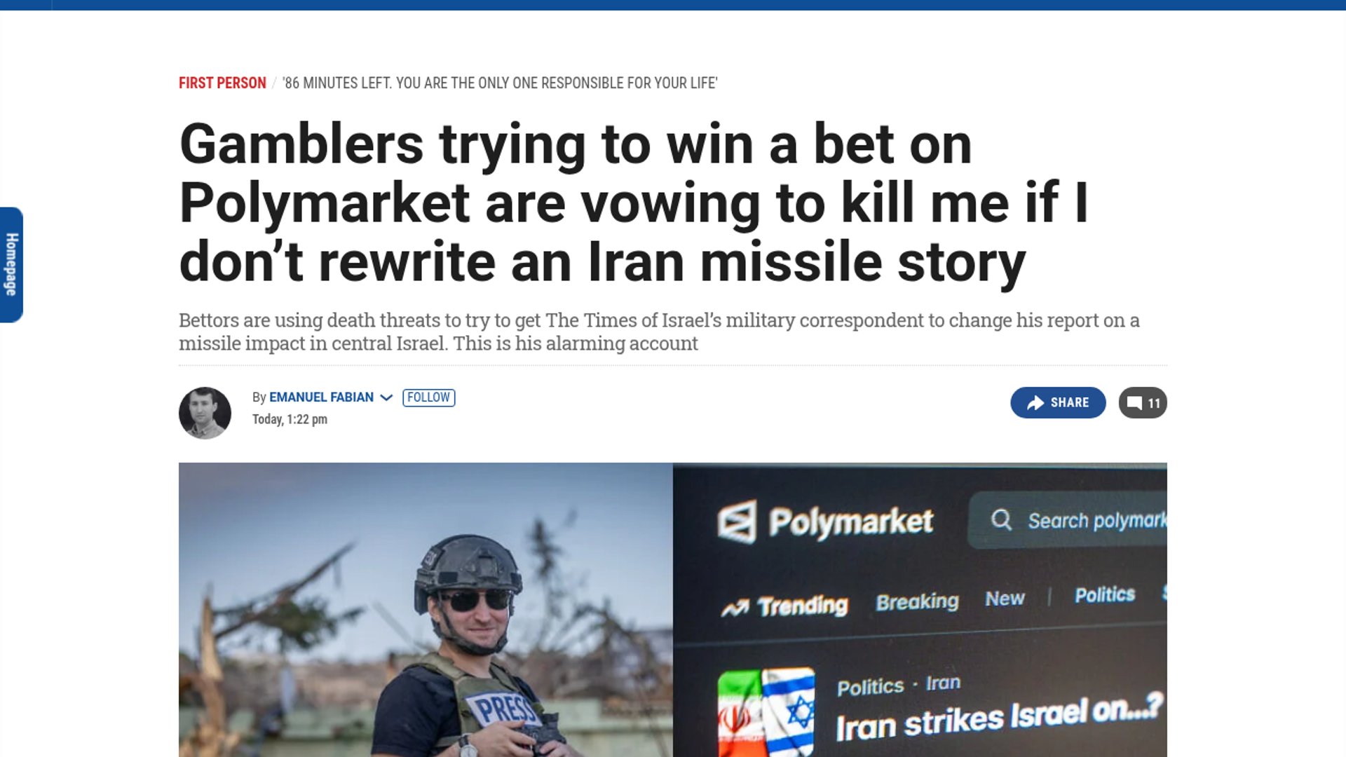 Times of Israel correspondent Emanuel Fabian received death threats from Polymarket gamblers attempting to force a "correction" of his reporting on an Iranian missile impact. The incident highlights the dangerous real-world incentives created by high-stakes prediction markets on sensitive geopolitical events.