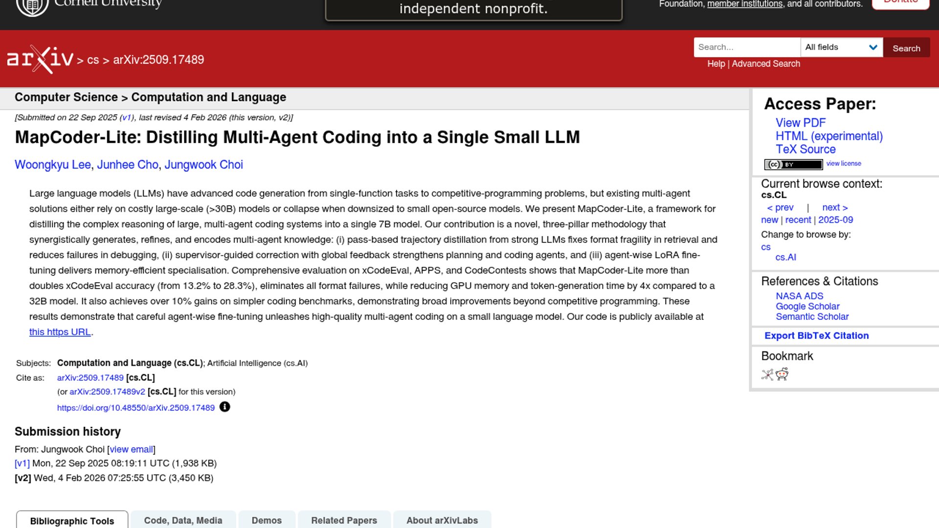 MapCoder-Lite distills multi-agent coding into a single Qwen2.5-7B-Instruct model using four role-specific LoRA adapters. On xCodeEval, it more than doubles accuracy from 13.2% to 28.3% while cutting GPU memory and token-generation time by 4x versus a 32B baseline.