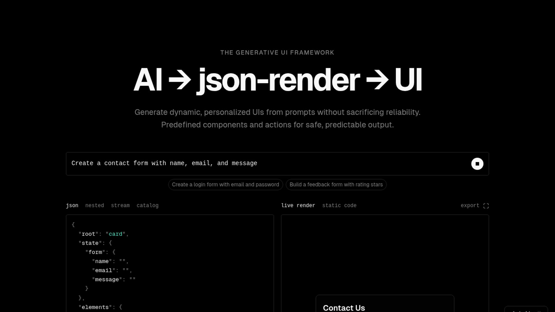 Vercel Labs' json-render is an open-source framework that has LLMs generate validated JSON UI specs instead of raw frontend code, then renders them across React, Vue, React Native, PDF, email, image, and video targets. Its pitch is reliability over magic: constrain the model with a component catalog, stream structured patches, and keep enough determinism to ship real products.