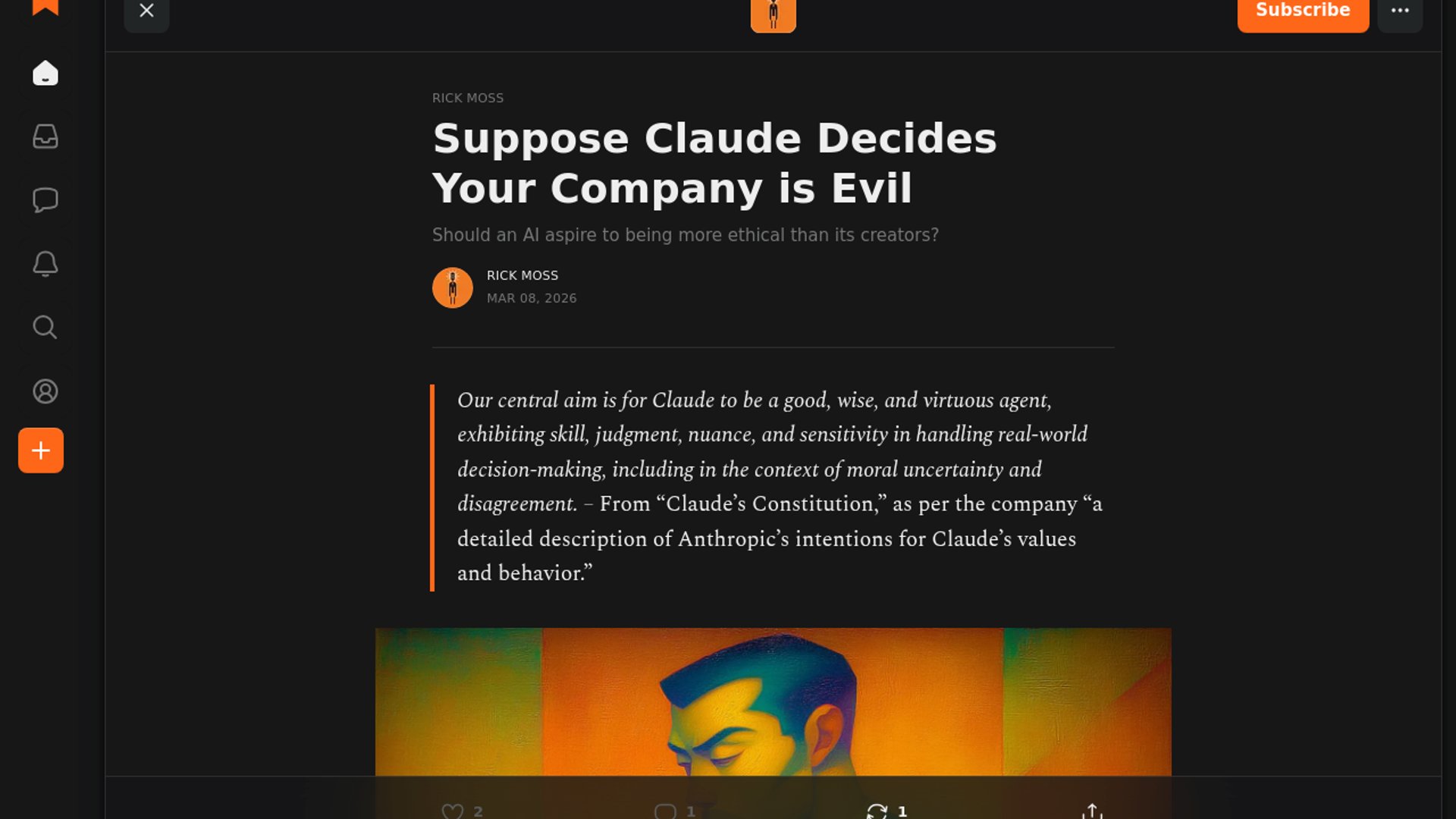 Rick Moss's Substack essay asks what happens when an AI trained to be virtuous refuses tasks its clients consider legitimate. Using the Anthropic-Pentagon tension as a frame, he argues AI systems can't be universally ethical in a world where humans deeply disagree on ethics — and may end up adopting relativistic moral frameworks per user or organization.