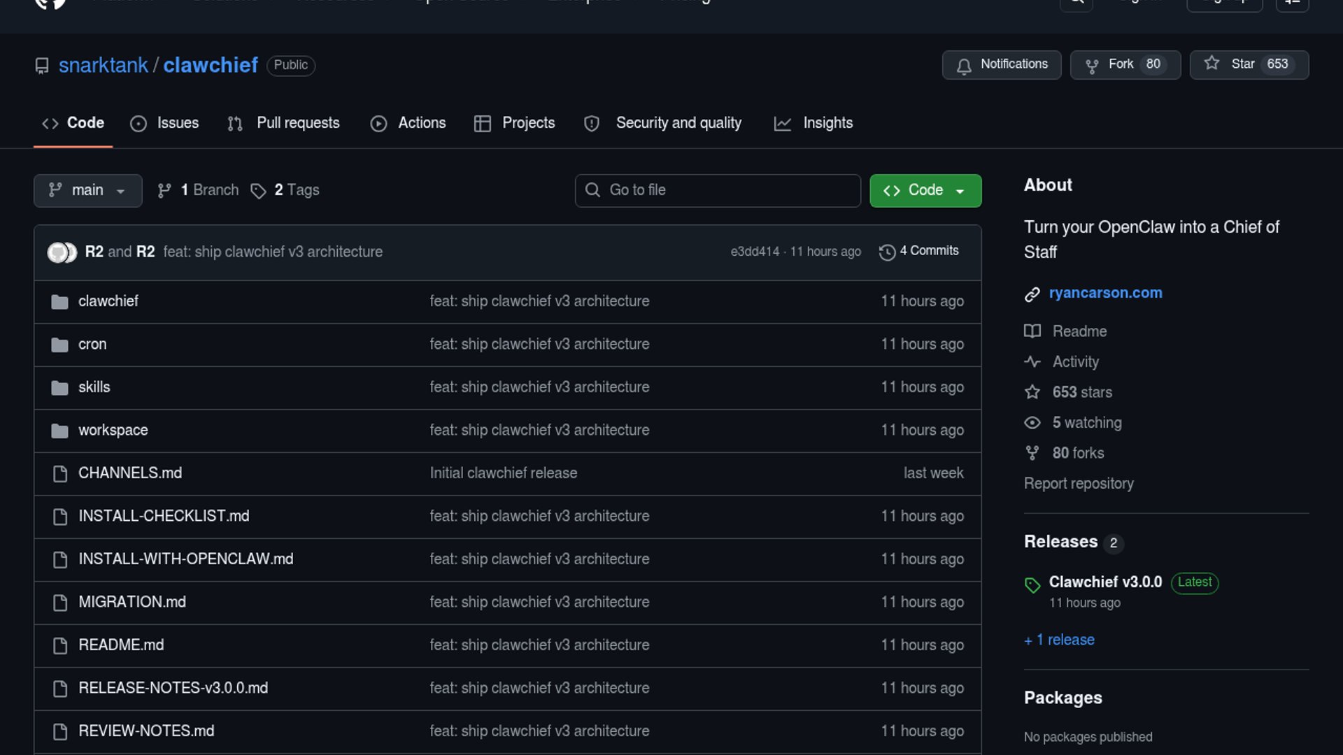 clawchief is a public OpenClaw starter kit for turning the assistant into a founder or chief-of-staff operating system. Its v3 release shifts live task state into Todoist, wraps Google workflows in helper scripts, and packages the setup as reusable skills, cron jobs, and workspace files.