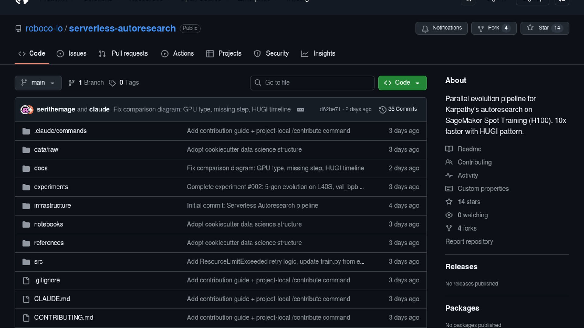 This open-source pipeline adapts Karpathy’s autoresearch to SageMaker Spot, running autonomous ML experiment generations in parallel instead of burning an H100 overnight. The author reports 25 experiments for $0.44, with a tutorial and docs bundled for reproduction.
