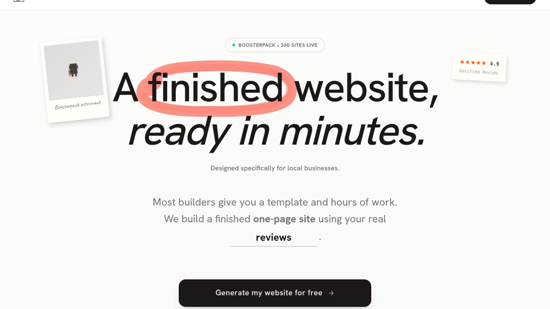 Boosterpack is an accountless x402-gated website-generation API that lets an agent pay once to kick off a background pipeline for finished local-business sites and later collect a signed ZIP export through a private status URL. It also ships a Google Places helper to resolve place IDs and seed the generator with richer business data, photos, and contact signals.