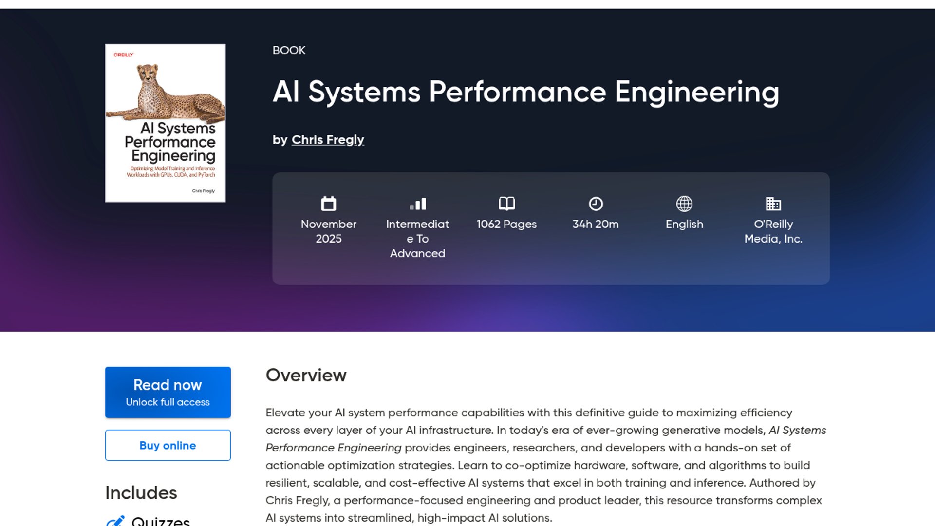 - –Fregly’s book is explicitly hands-on and optimization-heavy: benchmarking, profiling, kernel tuning, distributed training, inference serving, and a 175+ item checklist