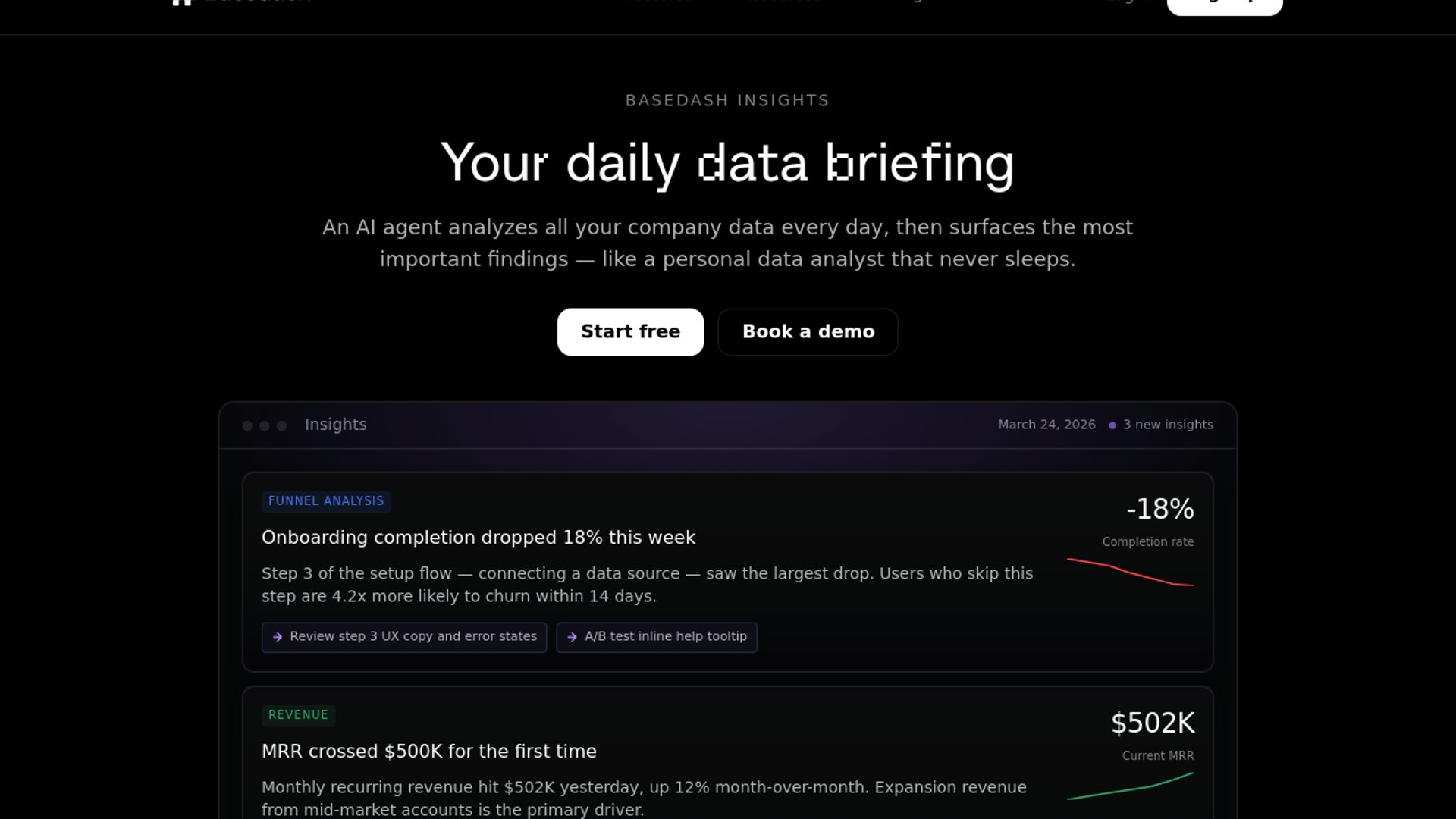 Basedash Insights is an autonomous AI agent that continuously monitors connected databases to surface proactive, natural language business insights without requiring SQL or manual dashboards. The zero-query tool identifies anomalies, funnel drop-offs, and growth trends directly from raw data sources.