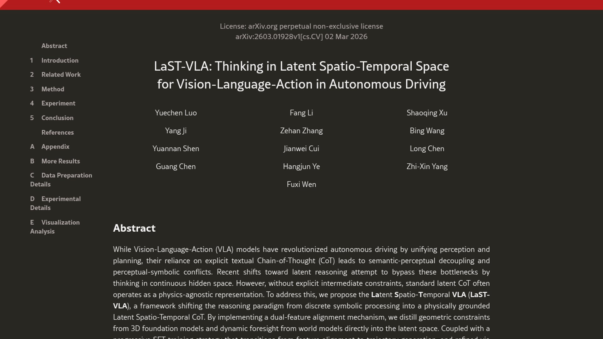 LaST-VLA is a new Xiaomi EV and Tsinghua research framework for autonomous driving that replaces explicit textual chain-of-thought with physically grounded latent spatio-temporal reasoning. The paper reports state-of-the-art results on NAVSIM v1 and v2, plus strong gains on SURDS and NuDynamics for spatial and motion reasoning.