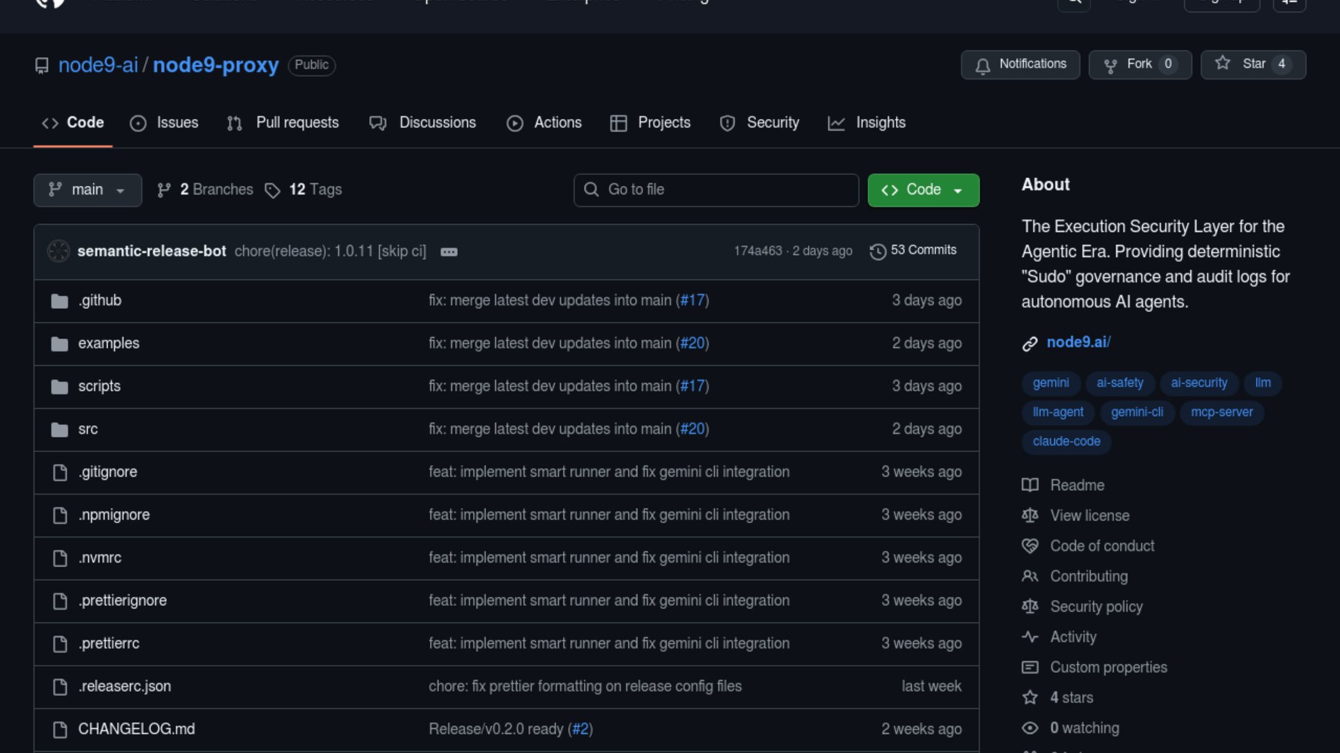 Node9 Proxy is an Apache-2.0 open-source execution security layer for AI agents that intercepts shell commands, tool calls, and API calls before they run. It adds multi-channel approvals, policy-based blocking, and node9 undo git snapshots so bad agent edits can be rolled back fast.