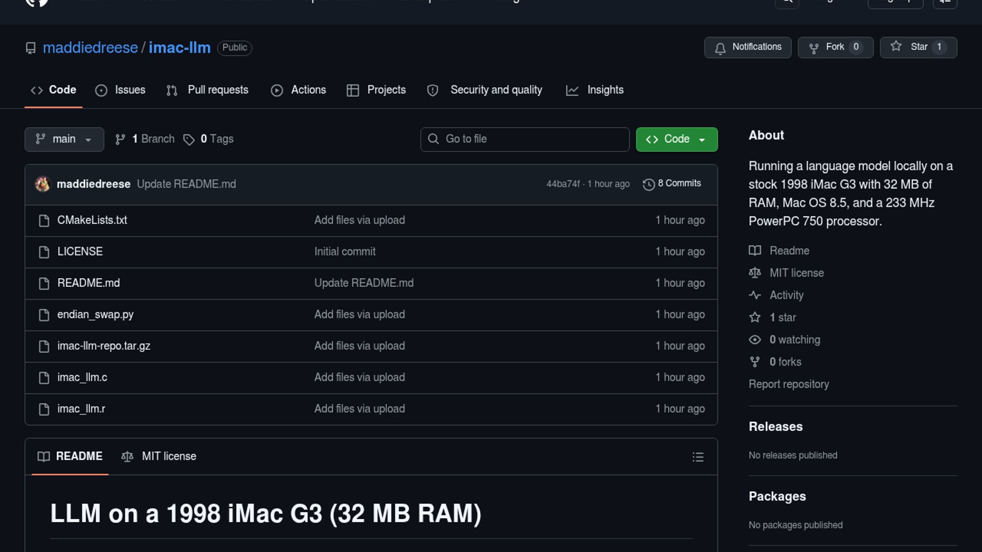Developer Maddie Dreese successfully ported Andrej Karpathy's `llama2.c` to run on a 233 MHz PowerPC G3 iMac. By using a 260K parameter TinyStories model and custom memory management, the project achieves local inference on 28-year-old hardware with 500x less RAM than modern machines.