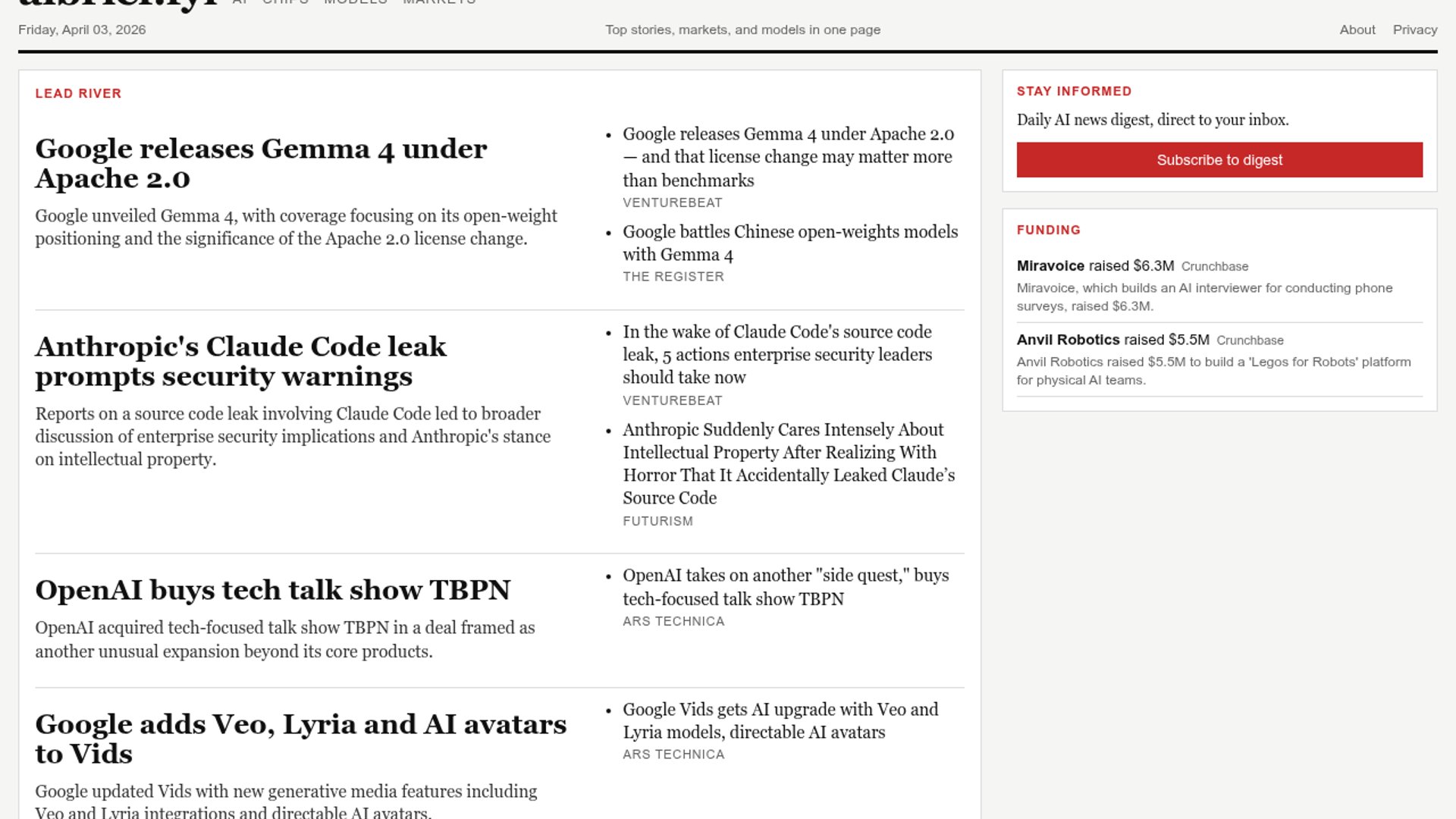 aibrief.fyi is a daily AI news roundup that bundles acquisitions, model releases, security incidents, product updates, and funding into a single digest. This edition spans OpenAI's media bet, Google's Gemma 4 license shift, the Claude Code leak, the Axios npm compromise, and several smaller product and funding moves.
