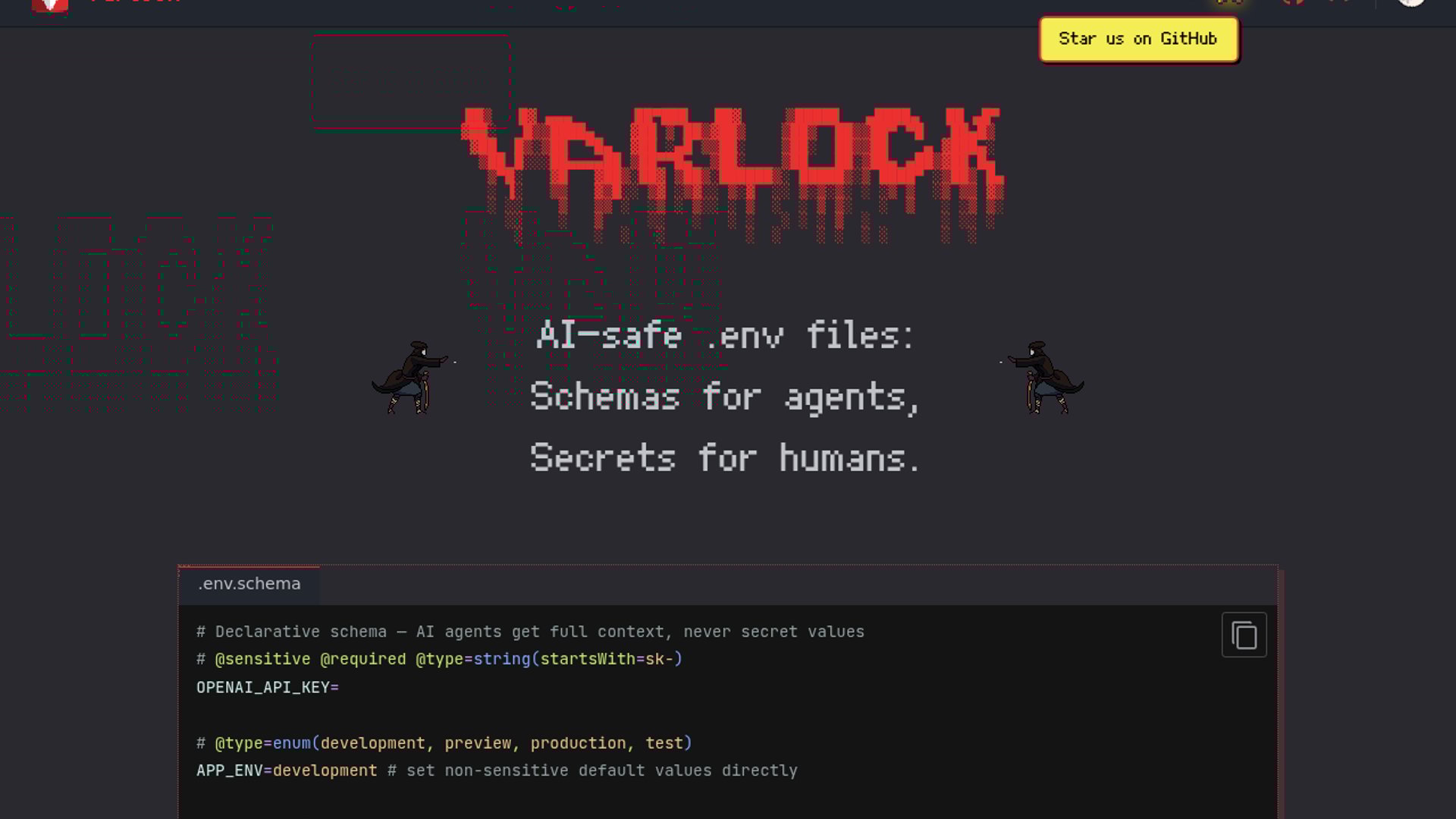 Varlock is an open-source environment-variable tool that replaces plaintext .env sharing with .env.schema contracts, validation, and runtime secret resolution from providers like 1Password, Bitwarden, and AWS. It positions itself as a safer way to keep config AI-readable while keeping credentials out of source control and prompts.