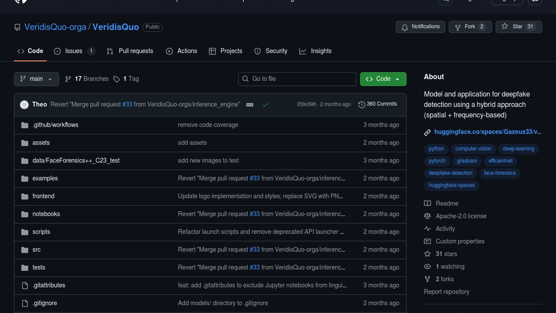 VeridisQuo is an open-source deepfake detection project that combines an EfficientNet-B4 spatial stream with FFT and DCT frequency analysis, then uses GradCAM overlays to show which facial regions triggered the prediction. The GitHub repo also includes an API and a Hugging Face demo, which makes it more practical than a typical university-only release.