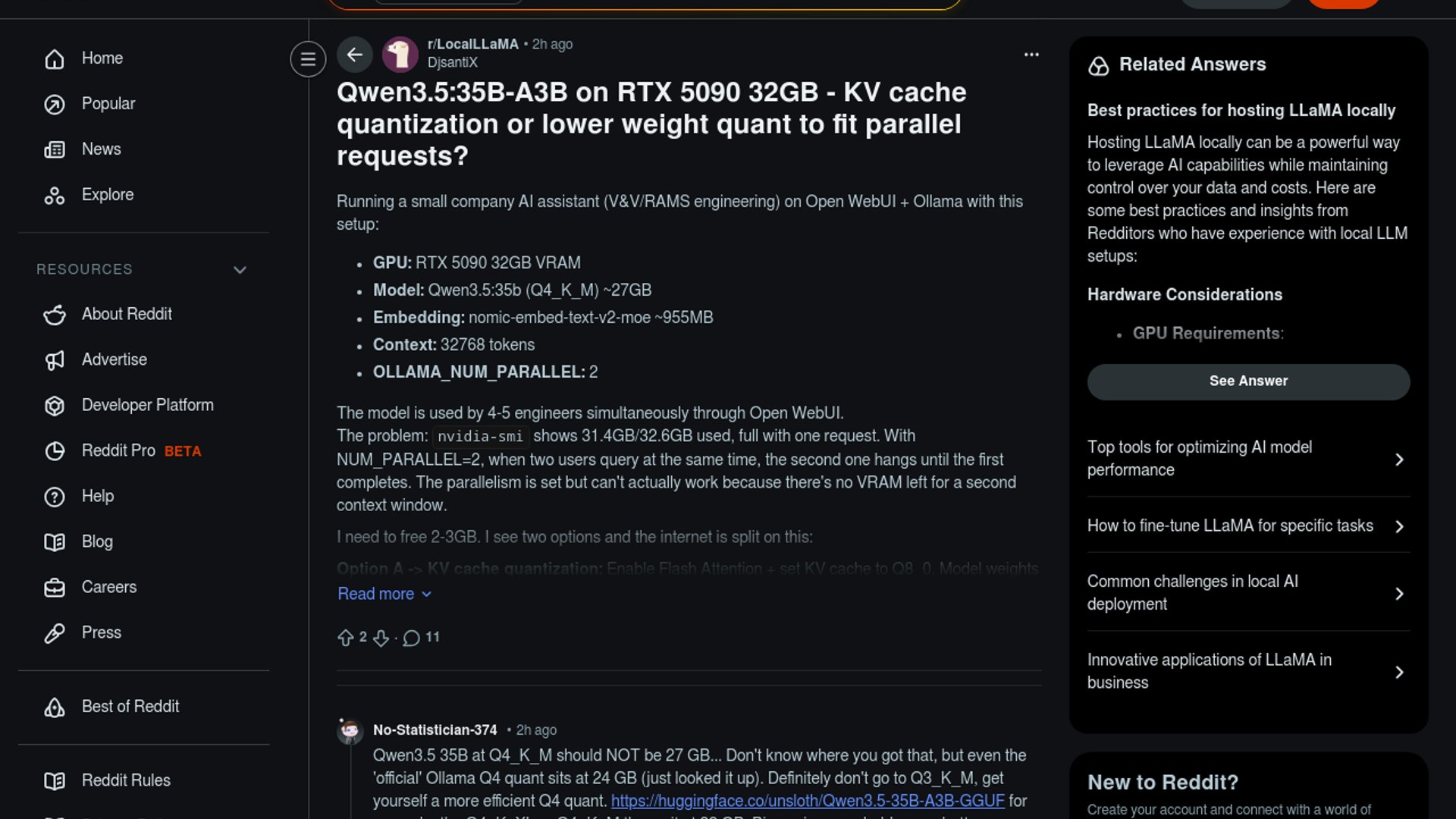 I’d start with Flash Attention plus OLLAMA_KV_CACHE_TYPE=q8_0, keep Q4 weights, and only trim context if two sessions still do not fit. For a V&V/RAMS assistant, preserving base-weight quality matters more than squeezing every last MB out of the model file. Ollama says OLLAMA_NUM_PARALLEL scales memory with parallel requests times context length, so the second 32k prompt is exactly the kind of workload that blows the VRAM budget. Ollama also says q8_0 cuts K/V cache memory to about half of f16 with usually no noticeable quality hit, which is the cleanest way to buy the 2-3GB you need. Dropping to Q3 would reduce precision on every token, which is a worse trade for structured reasoning, calculations, and normative lookups than compressing the cache. Qwen3.5 is already a 35B model with 3B activated and 262k native context, so the bottleneck here is serving economics, not model capability. If q8_0 still leaves you short, I’d step down to 24k before 16k, but I’d treat Q3 as the last resort.