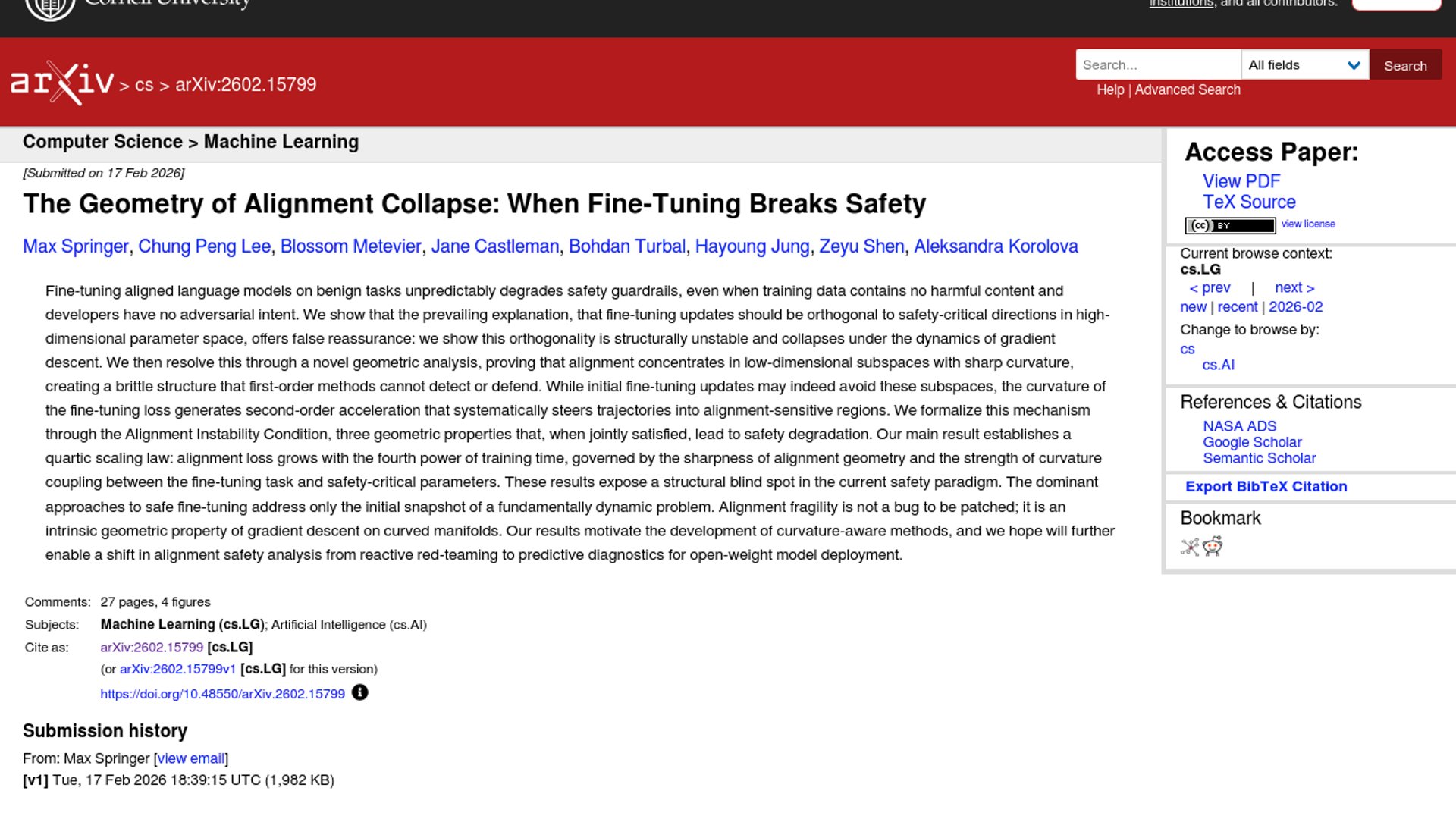 This Princeton-led preprint argues that even benign fine-tuning can erode model safety because alignment lives in sharply curved, low-dimensional subspaces that gradient descent eventually re-enters. Its core contribution is a quartic time-scaling law for alignment loss, giving safety researchers a more predictive way to think about guardrail degradation.