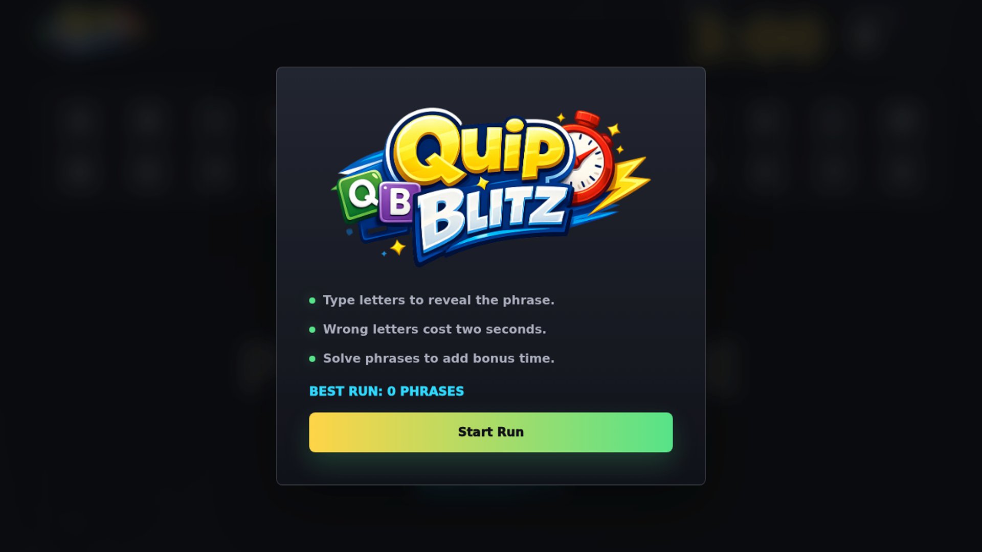 Quip Blitz is a browser game where players type letters to reveal hidden phrases against a 3-minute clock, with wrong guesses costing time and solved phrases adding bonuses. The maker frames it as a 2015 game-jam concept rebuilt in about half an hour with GPT-5.5, with the model also helping generate the hidden words and clues.
