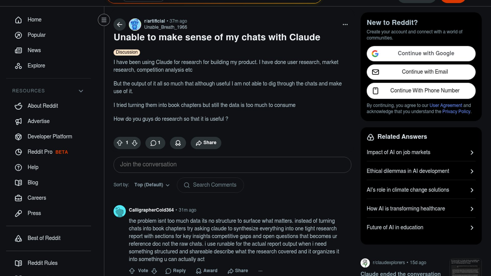 As AI models like Claude generate increasingly massive amounts of research data, developers are struggling to extract and structure actionable insights from long conversational threads. The community is highlighting a critical gap between generating comprehensive information and actually synthesizing it for practical product development.