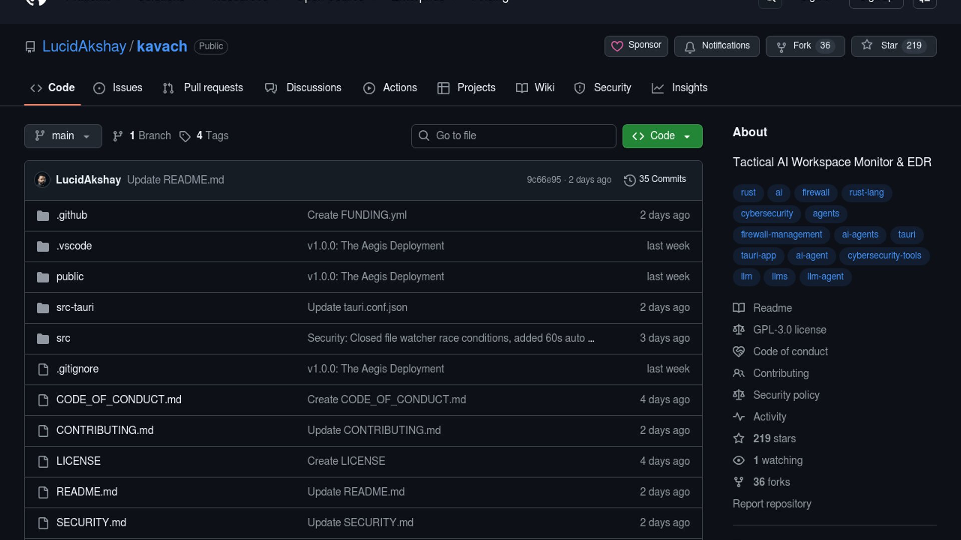 Kavach is an open-source Rust, React, and Tauri desktop guard for AI agents and local LLMs, built to watch workspace activity, quarantine risky file actions, and give users rollback and response tools. It positions itself as an application-layer EDR for agentic work rather than a hard sandbox, with kernel-level blocking still on the roadmap.