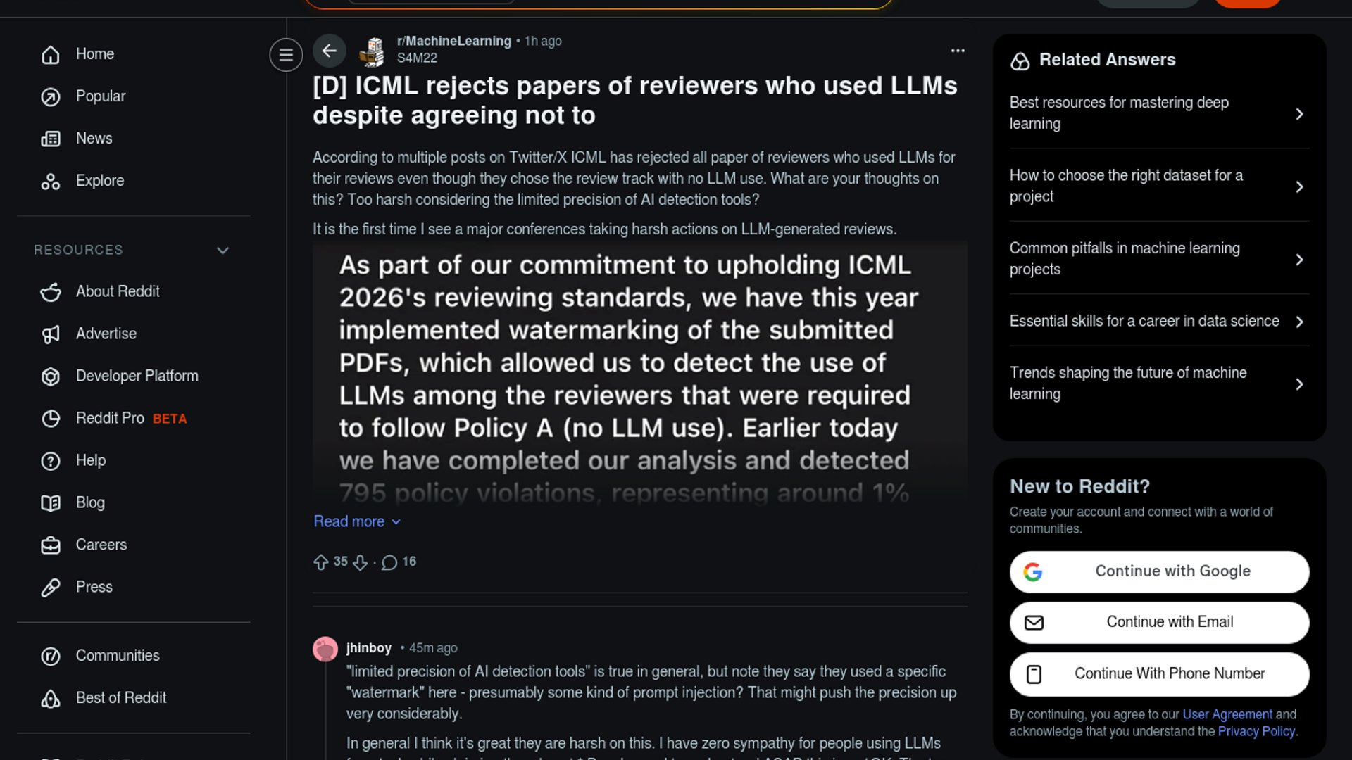 A Reddit thread says ICML rejected papers linked to reviewers who used LLMs despite signing up for a no-LLM track. The argument is really about enforcement: whether a hard penalty is justified when the detection method may not be perfect.