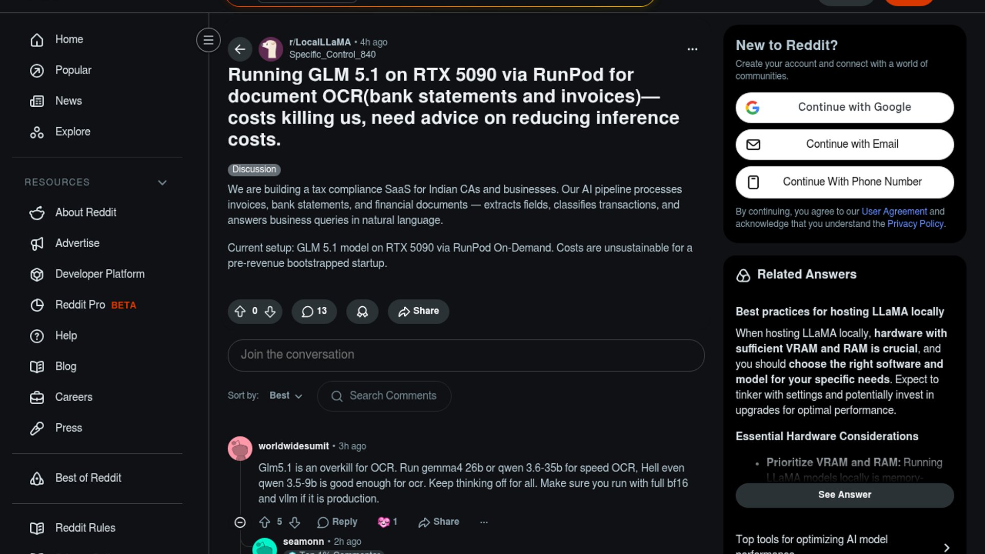 A bootstrapped tax-compliance SaaS team says its GLM-5.1 pipeline for invoices and bank statements on RTX 5090s via RunPod is becoming too expensive to sustain. The post asks for practical ways to cut inference costs without breaking document extraction and natural-language query quality.