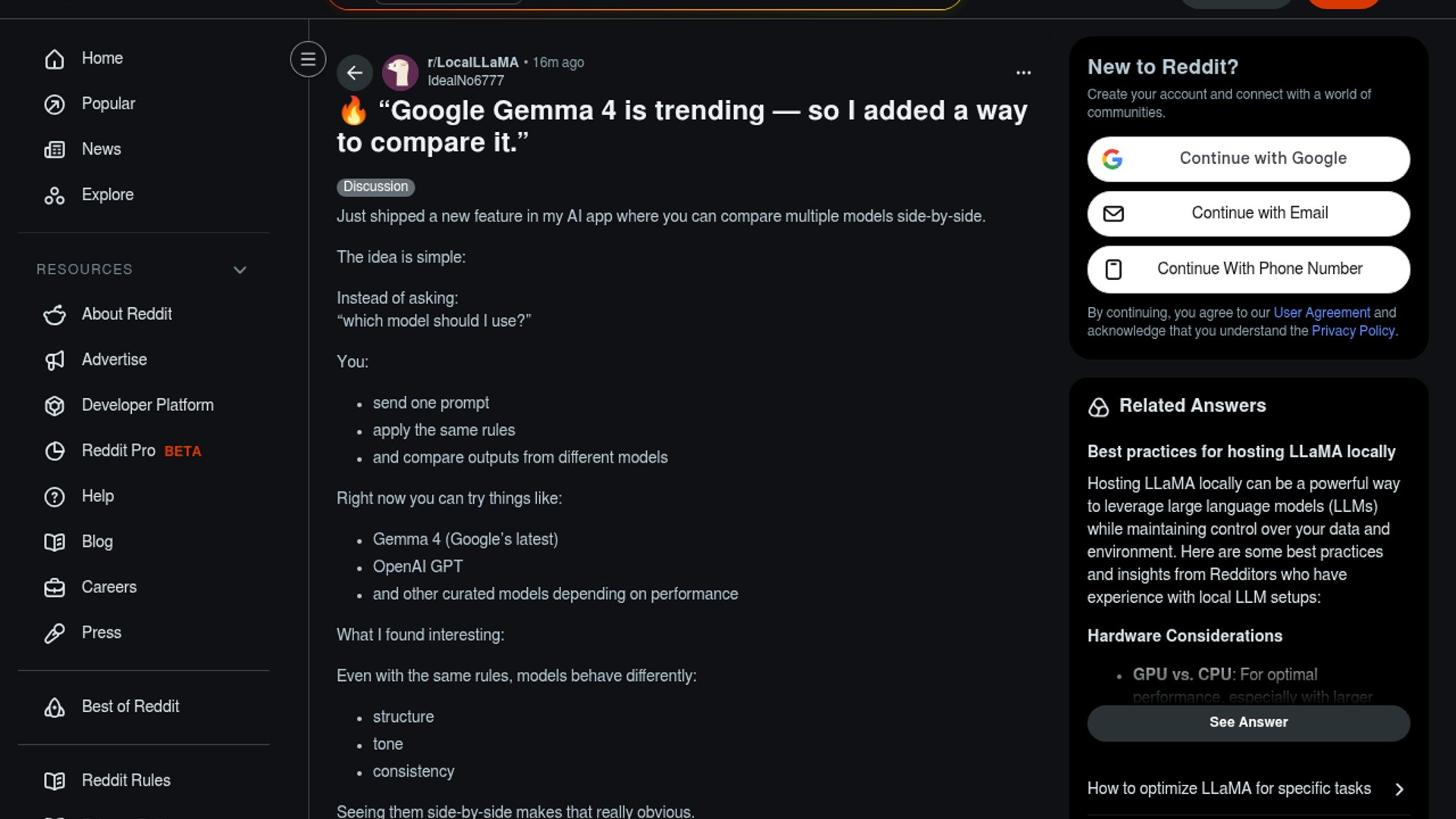 The app now lets users run one prompt across multiple models and compare outputs side by side, with Gemma 4, OpenAI GPT, and other curated options. Comparison stays optional, so the default flow still returns a single response.