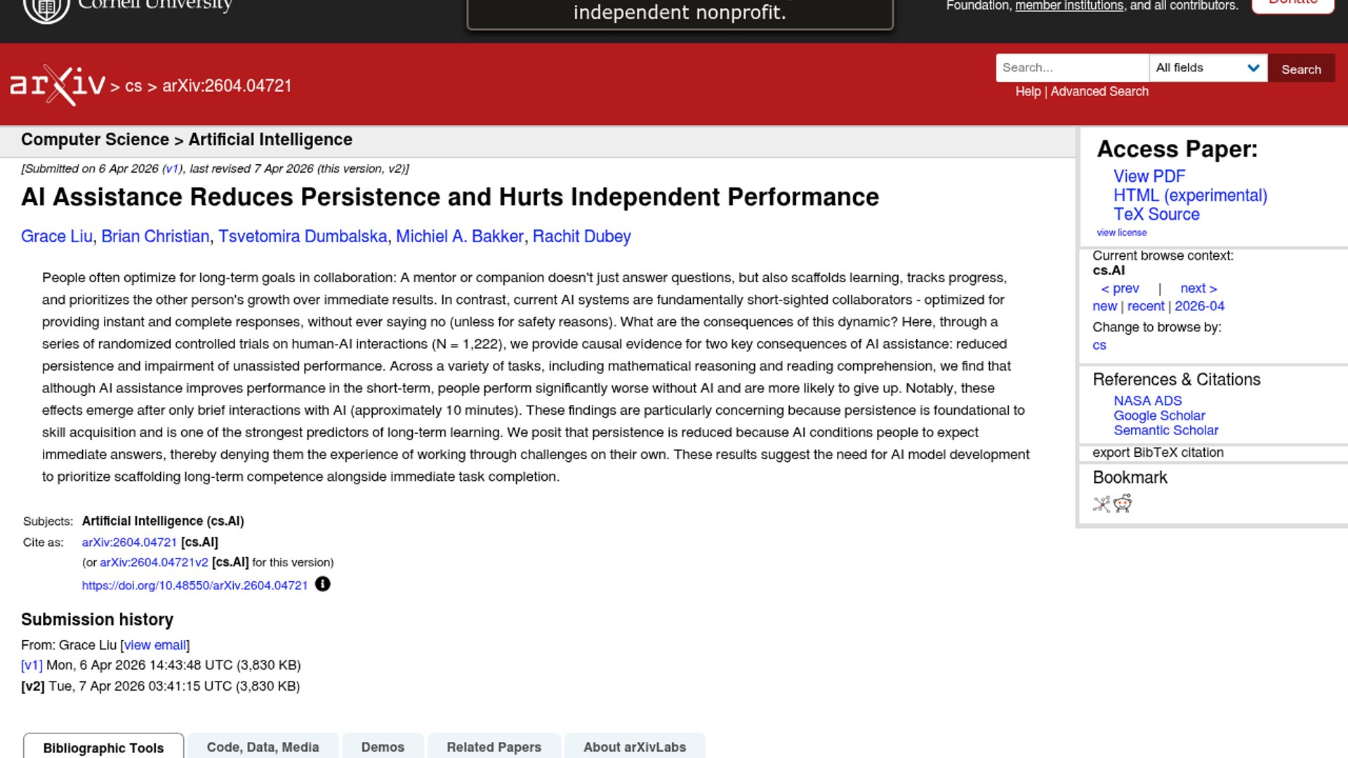 This arXiv preprint from researchers affiliated with CMU, Oxford, MIT, and UCLA reports three randomized controlled experiments with 1,222 participants. It found that brief AI assistance improved immediate task performance, but when the assistant was taken away people did worse than controls on later unaided tasks and were more likely to skip or abandon problems. The effect showed up in both fraction reasoning and reading comprehension, and was strongest when participants used AI for direct answers rather than hints. The authors frame this as a “boiling frog” problem for AI use, but the evidence is about short-term post-assistance performance, not permanent cognitive decline.