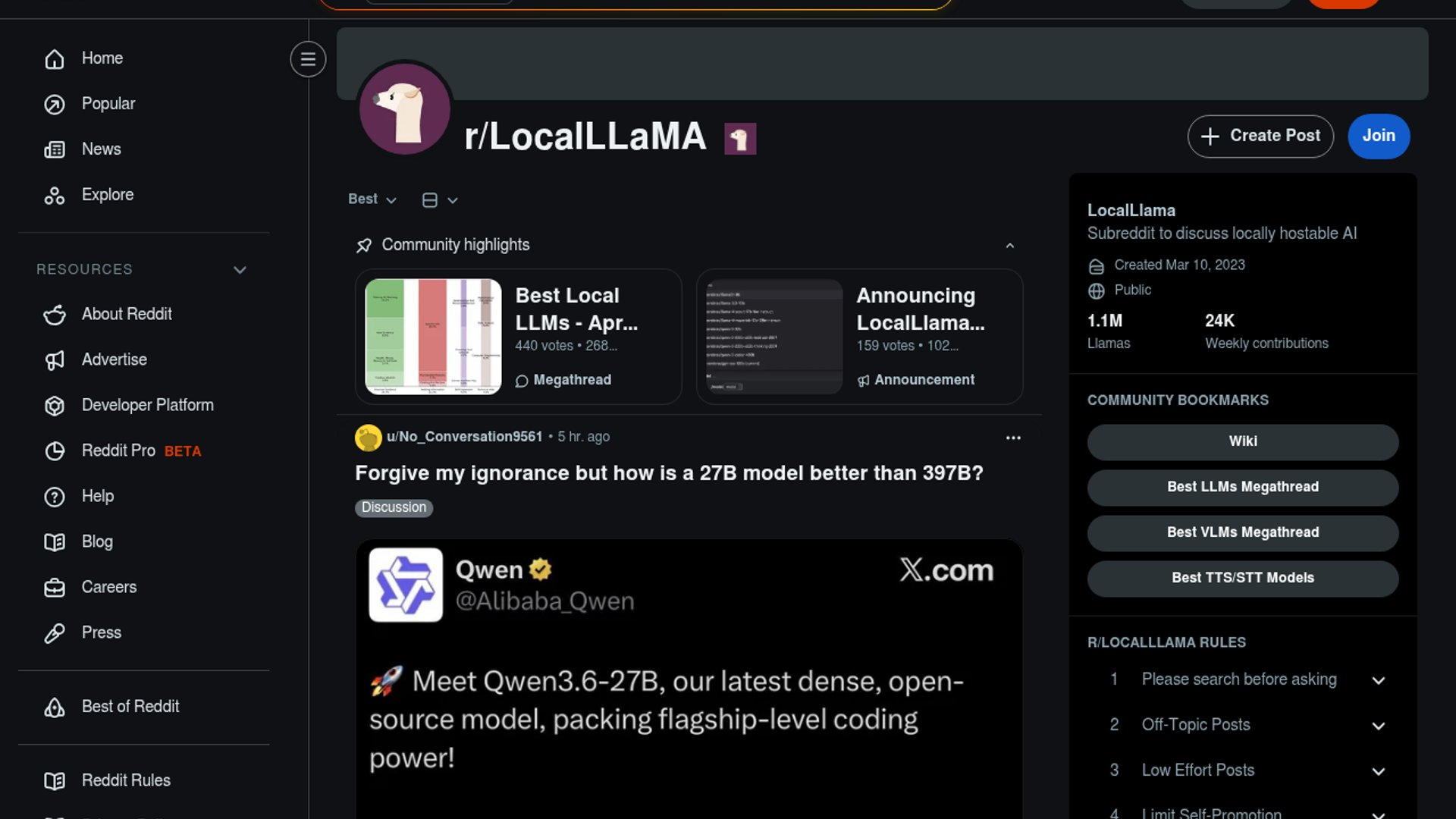 - –Qwen 3.6 35B is emerging as the "gold standard" for local agentic reliability, frequently outperforming much larger models when paired with local-first scaffolds.