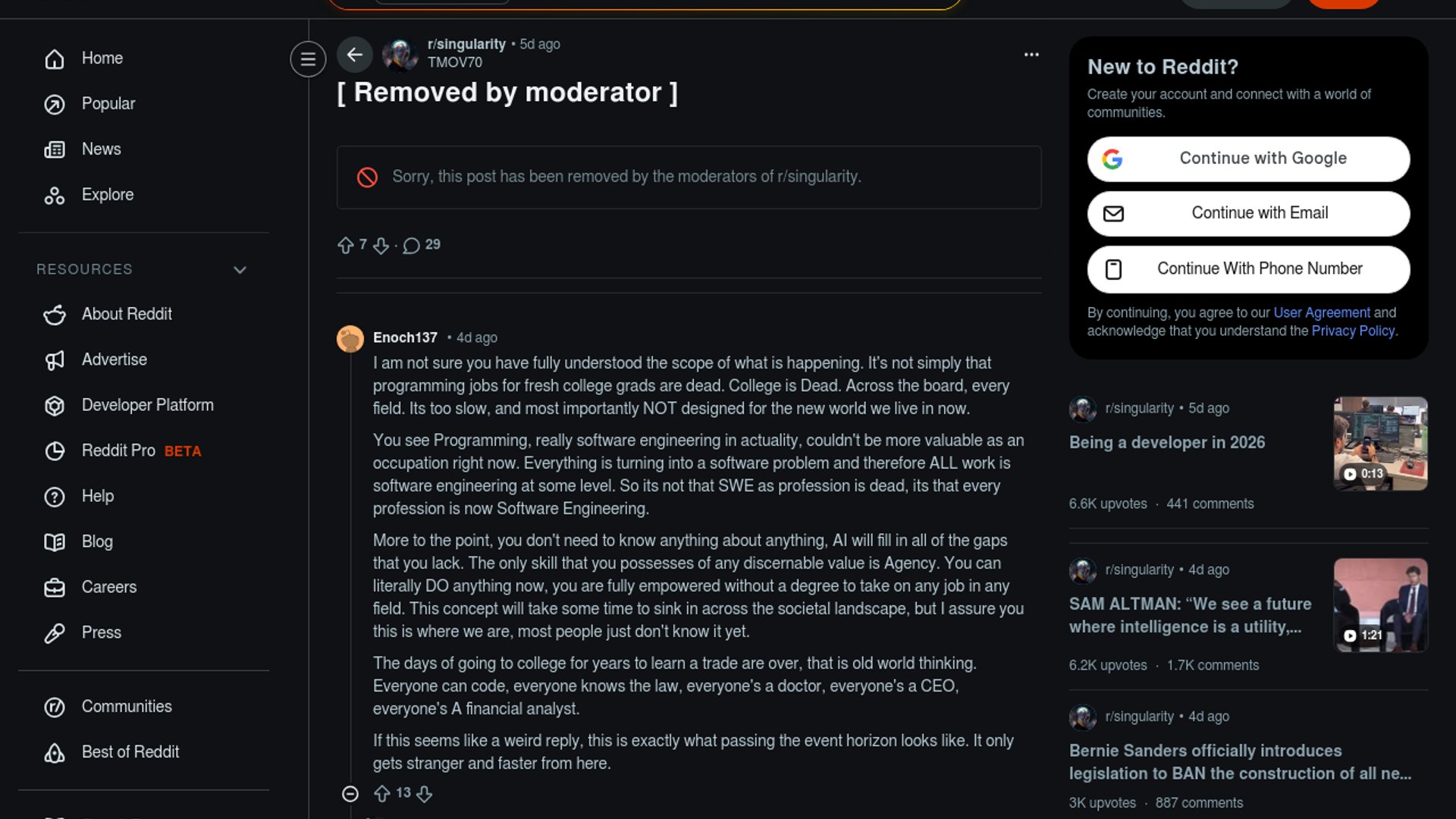 A Reddit discussion in r/singularity raises the widely shared concern about whether fresh CS graduates have a future as AI tools now generate full-stack web apps on demand. Entry-level developer postings have dropped ~60% between 2022 and 2024, and overall programmer employment fell 27.5% between 2023 and 2025.