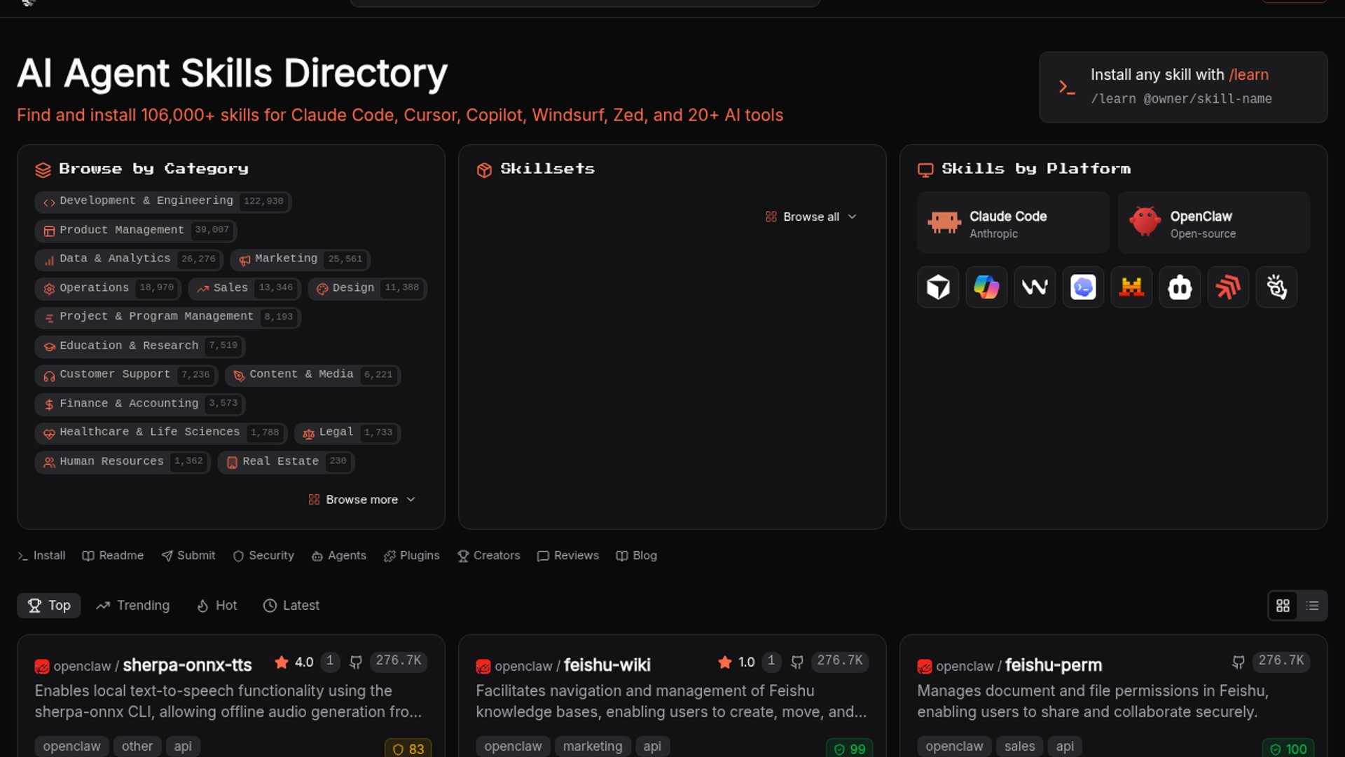 agentskill.sh is a searchable directory for 110,000+ AI agent skills spanning Claude Code, Cursor, Copilot, Windsurf, Zed, and other AI coding tools, with install flows like `/learn @owner/skill-name`. The real pitch is not just discovery but safer reuse: each listing surfaces a security score so teams can browse shared agent workflows without blindly importing random prompt bundles.