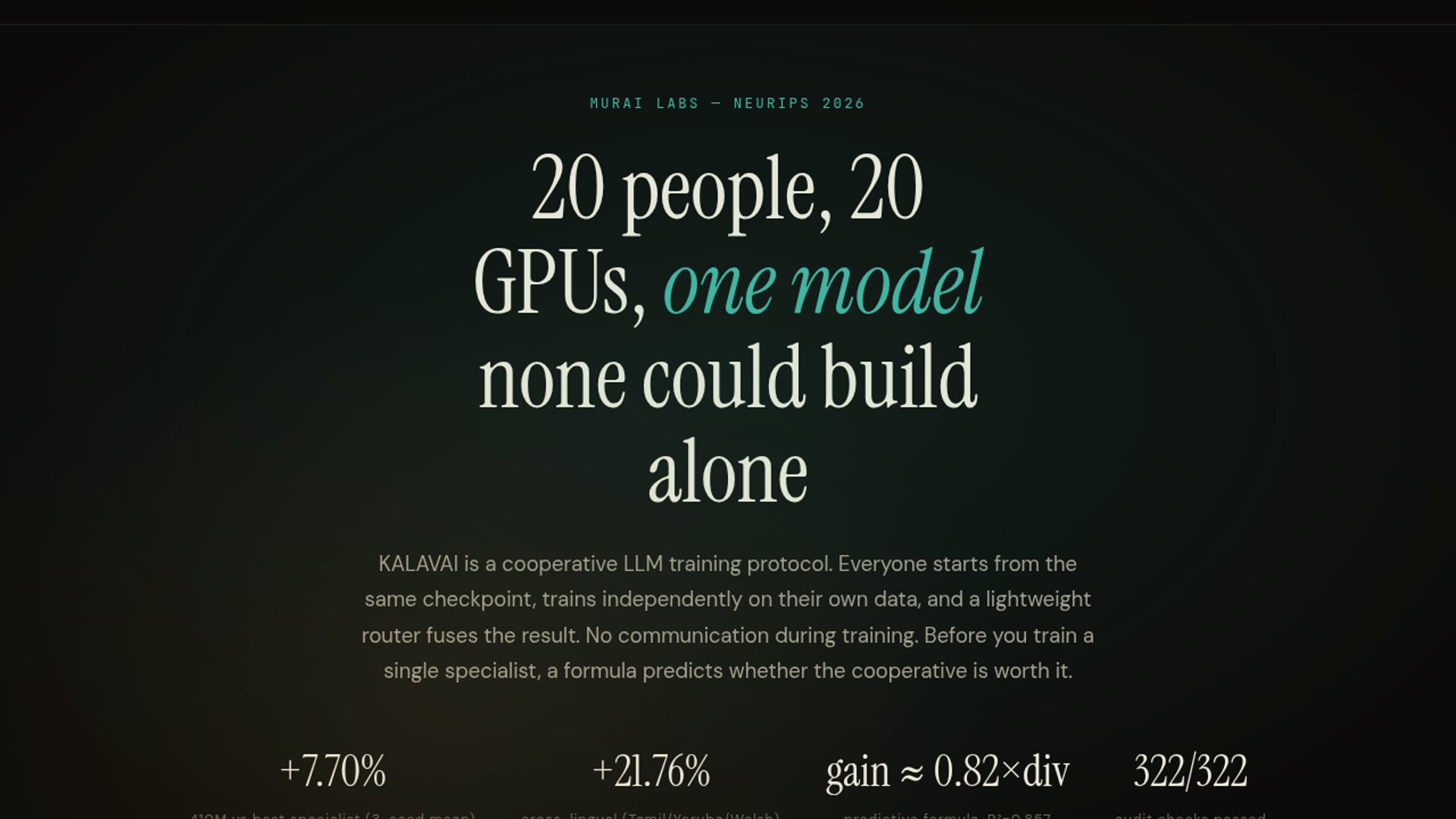 KALAVAI is an arXiv paper and open-source protocol for post-hoc LLM fusion: contributors independently fine-tune copies of a shared checkpoint, then a lightweight router combines them. Across Pythia 410M to 6.9B, the fused model beats the best specialist, and the paper reports a divergence-based heuristic for predicting when the cooperative will pay off.