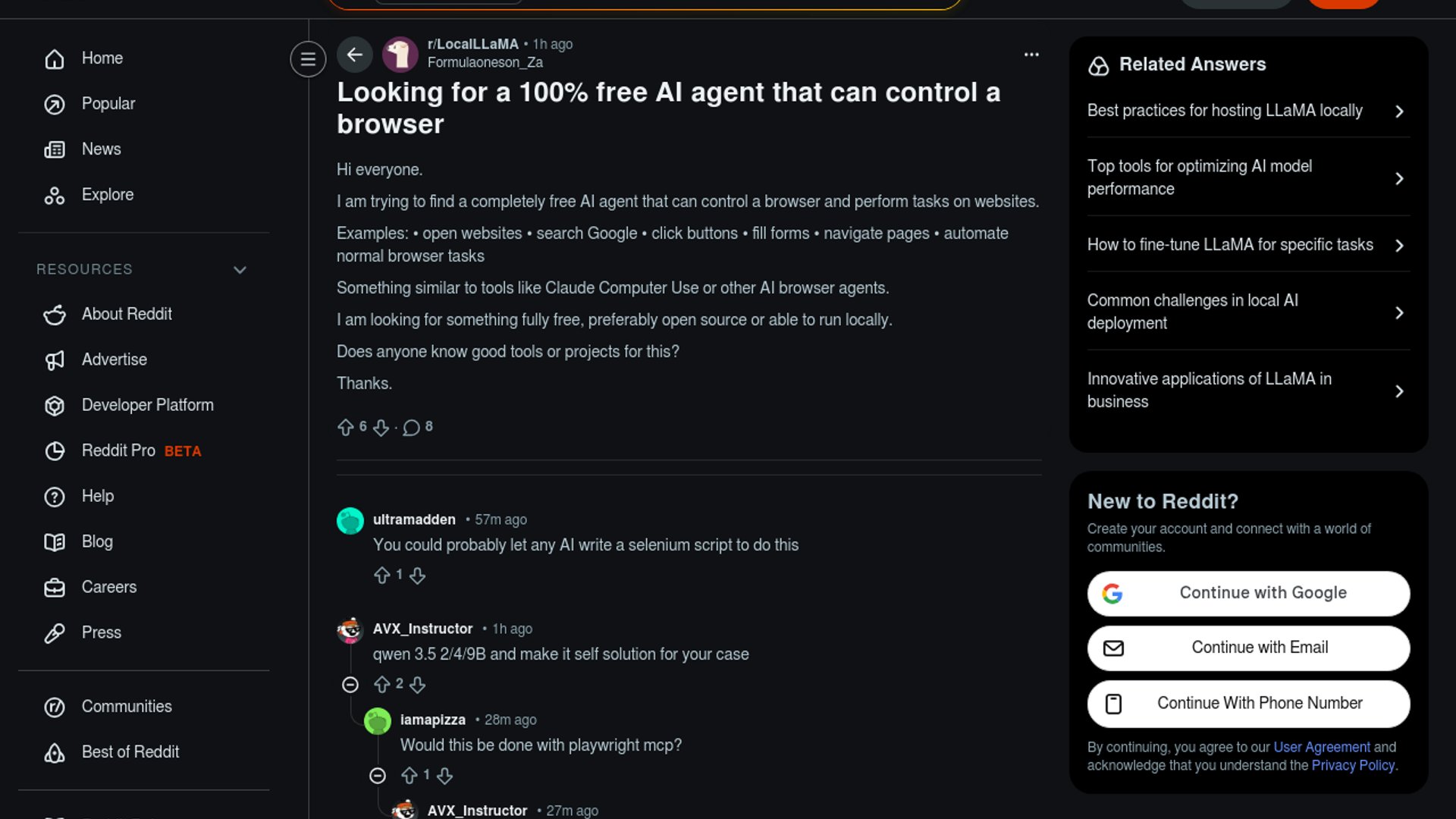 A developer on r/LocalLLaMA is asking for fully free, open-source, or locally runnable AI agents capable of controlling a browser — clicking, form-filling, navigating, and automating web tasks. The question reflects growing community interest in self-hosted alternatives to Claude Computer Use and similar commercial offerings.