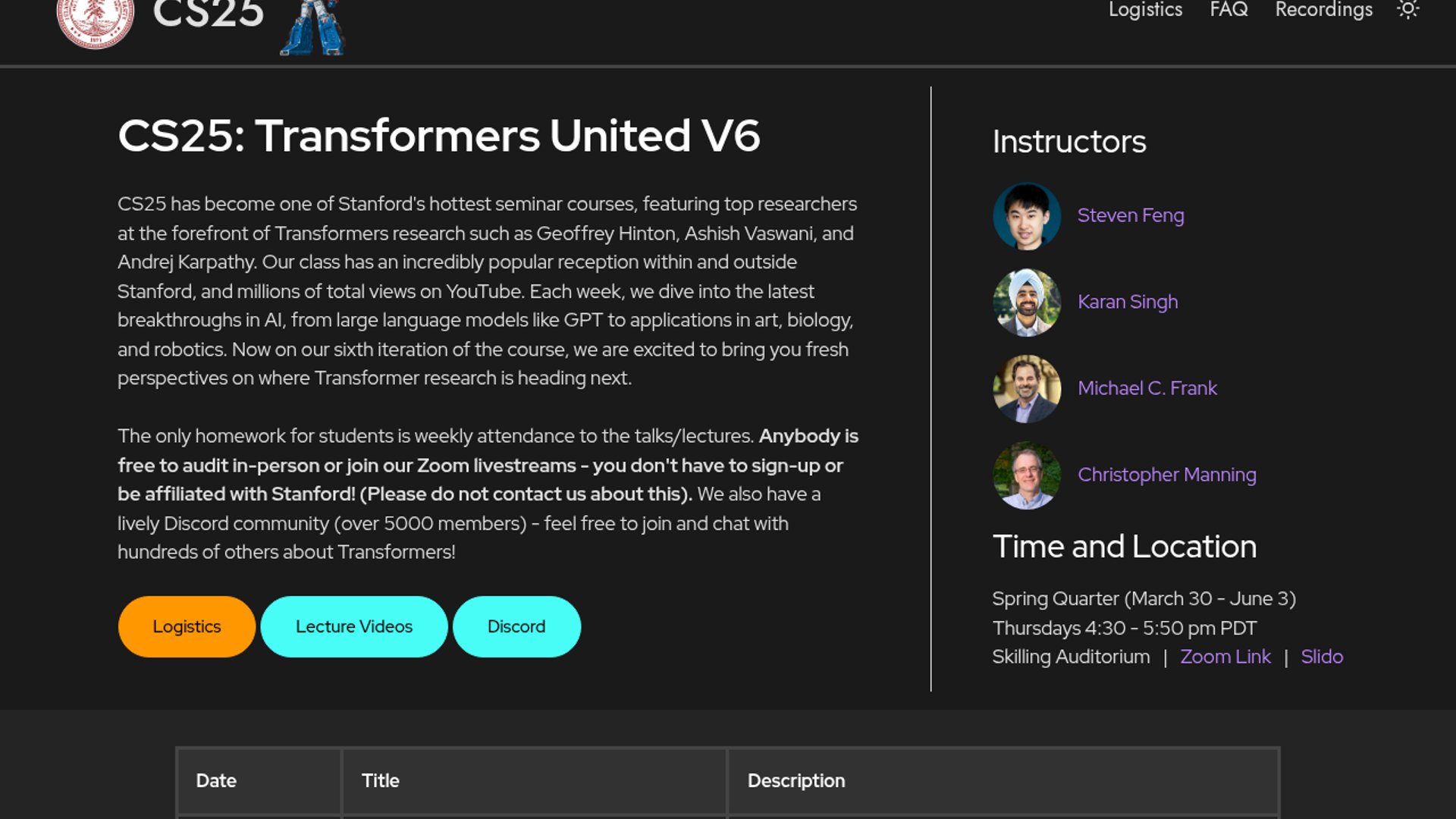 Stanford’s CS25 is back for its sixth iteration, running during Spring Quarter on Thursdays from 4:30-5:50pm PDT at Skilling Auditorium and on Zoom. The course is openly auditable by anyone, with lecture recordings posted online, and it focuses on the latest Transformer research spanning LLMs, art generation, biology, neuroscience, and robotics. Instructors this term are Steven Feng, Karan Singh, Michael C. Frank, and Christopher Manning, and the first session is an overview of Transformers.