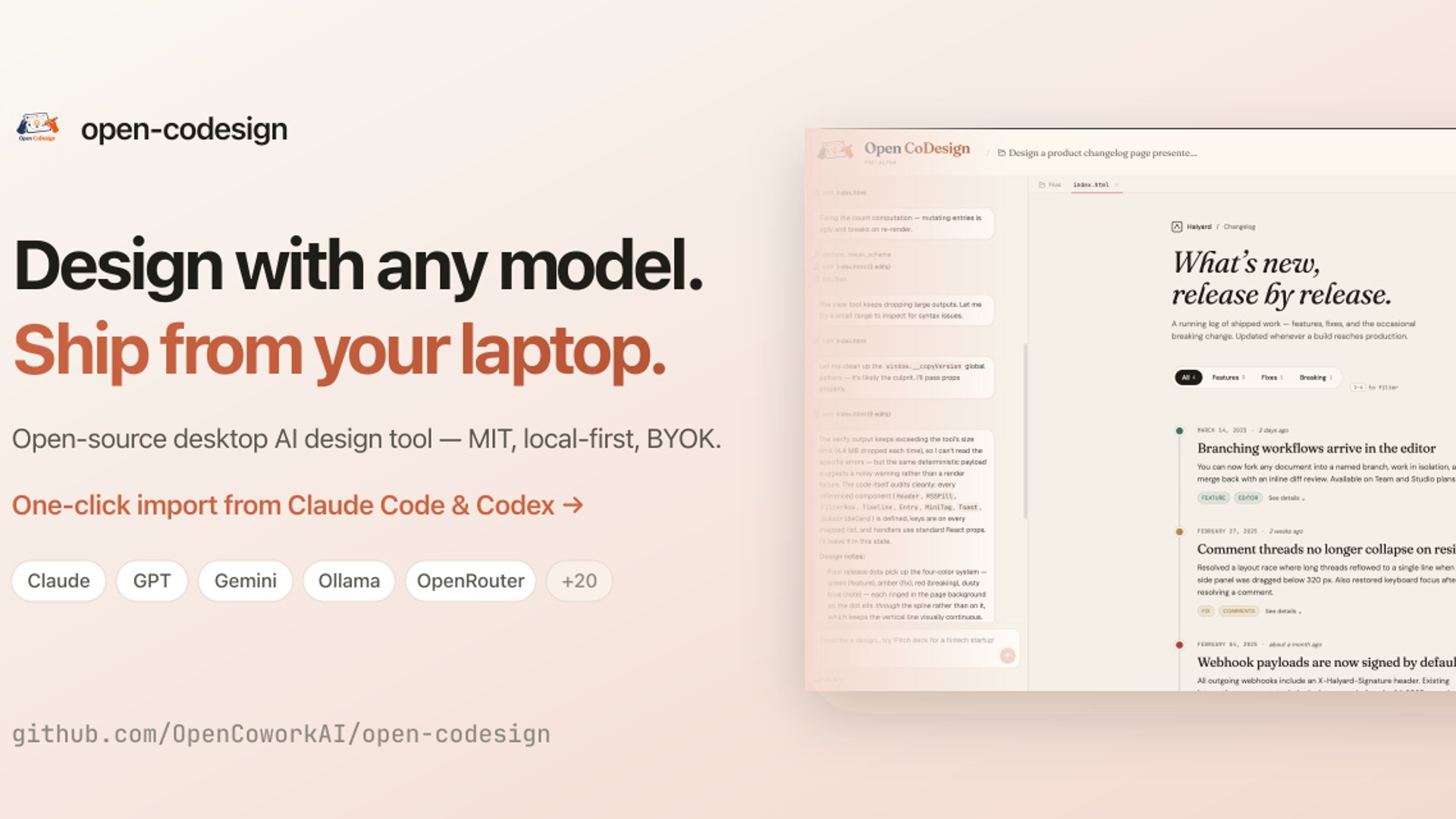 Open CoDesign is a local-first, BYOK desktop AI design tool that generates UI prototypes and marketing assets on-device. It provides a private, open-source alternative to cloud-based platforms like Vercel's v0, Bolt.new, and Lovable.