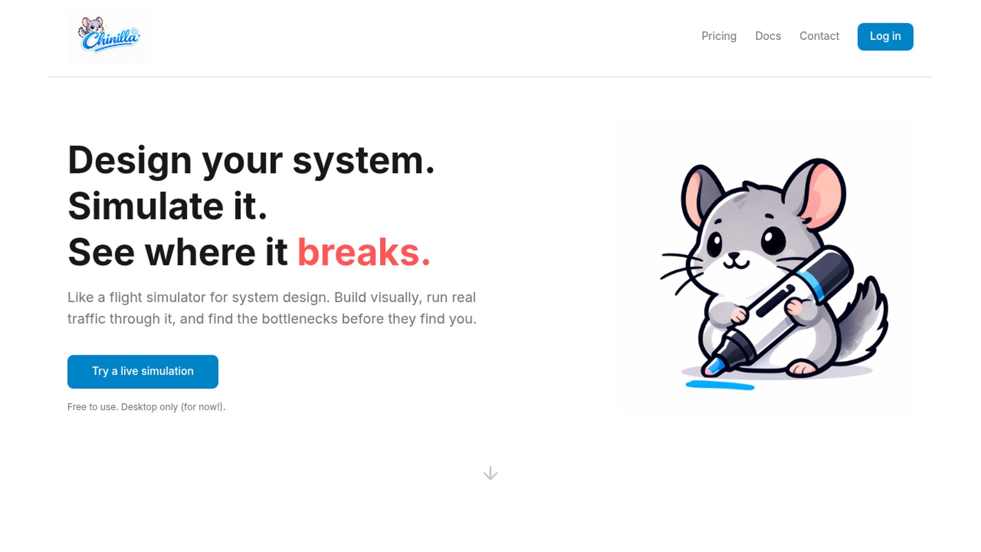 Chinilla is a visual system-design tool that lets you drag components onto a canvas, wire them together, and run deterministic simulations to see where traffic stalls or breaks. It pairs that runtime with AI-generated diagrams and exports to PNG, Mermaid, and Python so designs can move from exploration to documentation.