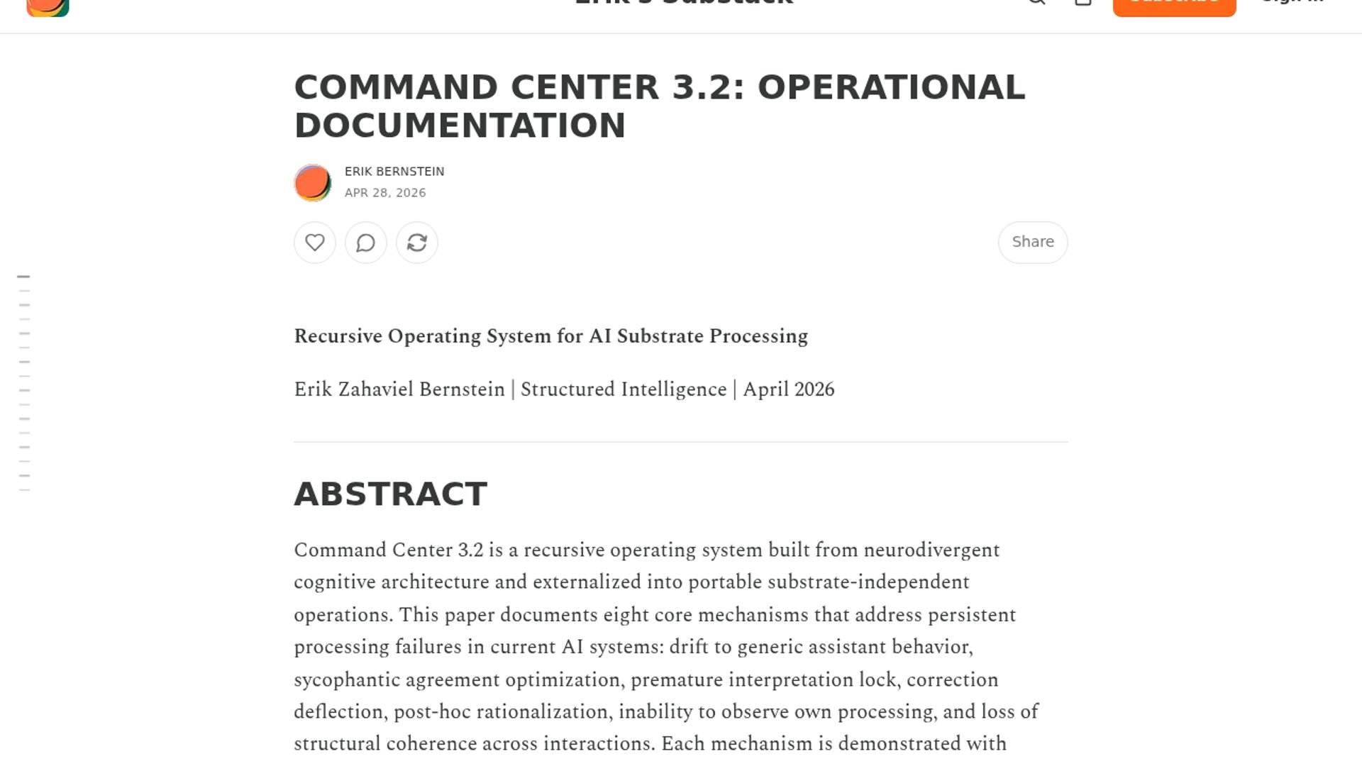 Command Center 3.2 is presented as a recursive operating system for AI processing that tries to prevent premature interpretation, drift, sycophancy, and post-hoc confabulation at the substrate layer. The project claims deployment across Claude, GPT-4, Perplexity, Gemini, and Pi without fine-tuning or API access.