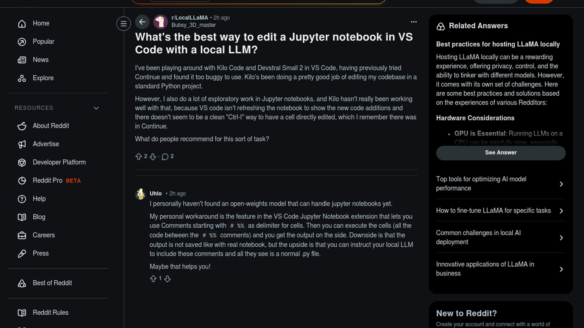 A LocalLLaMA user says Kilo Code works well with local models in ordinary Python projects, but notebook editing in VS Code still feels brittle because changes do not reliably refresh in ipynb files. They miss Continue's Ctrl+I edit flow and are looking for a smoother notebook-native workaround.