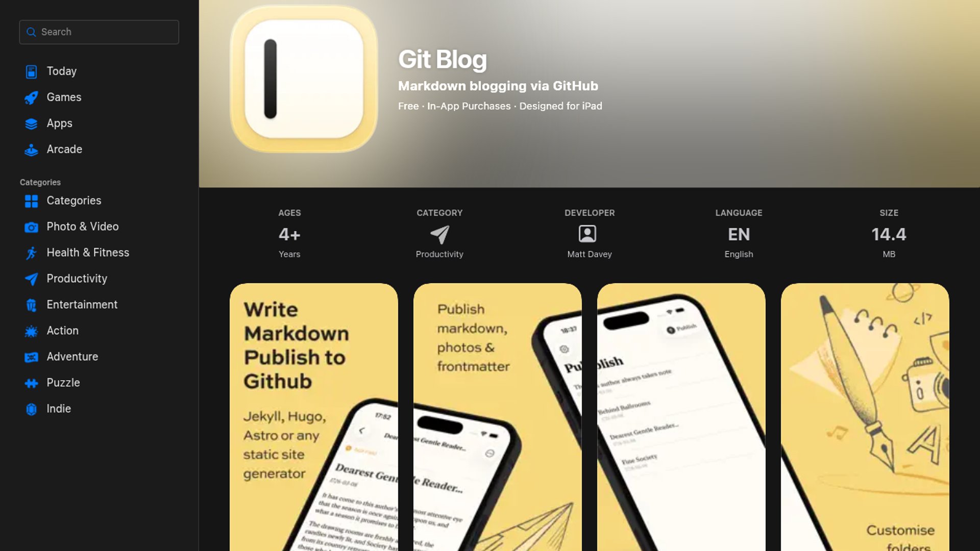 Git Blog turns an iPhone or iPad into a Markdown publishing tool for GitHub-backed static sites. It handles front matter templates, image uploads, and publishing by push, branch, or pull request.