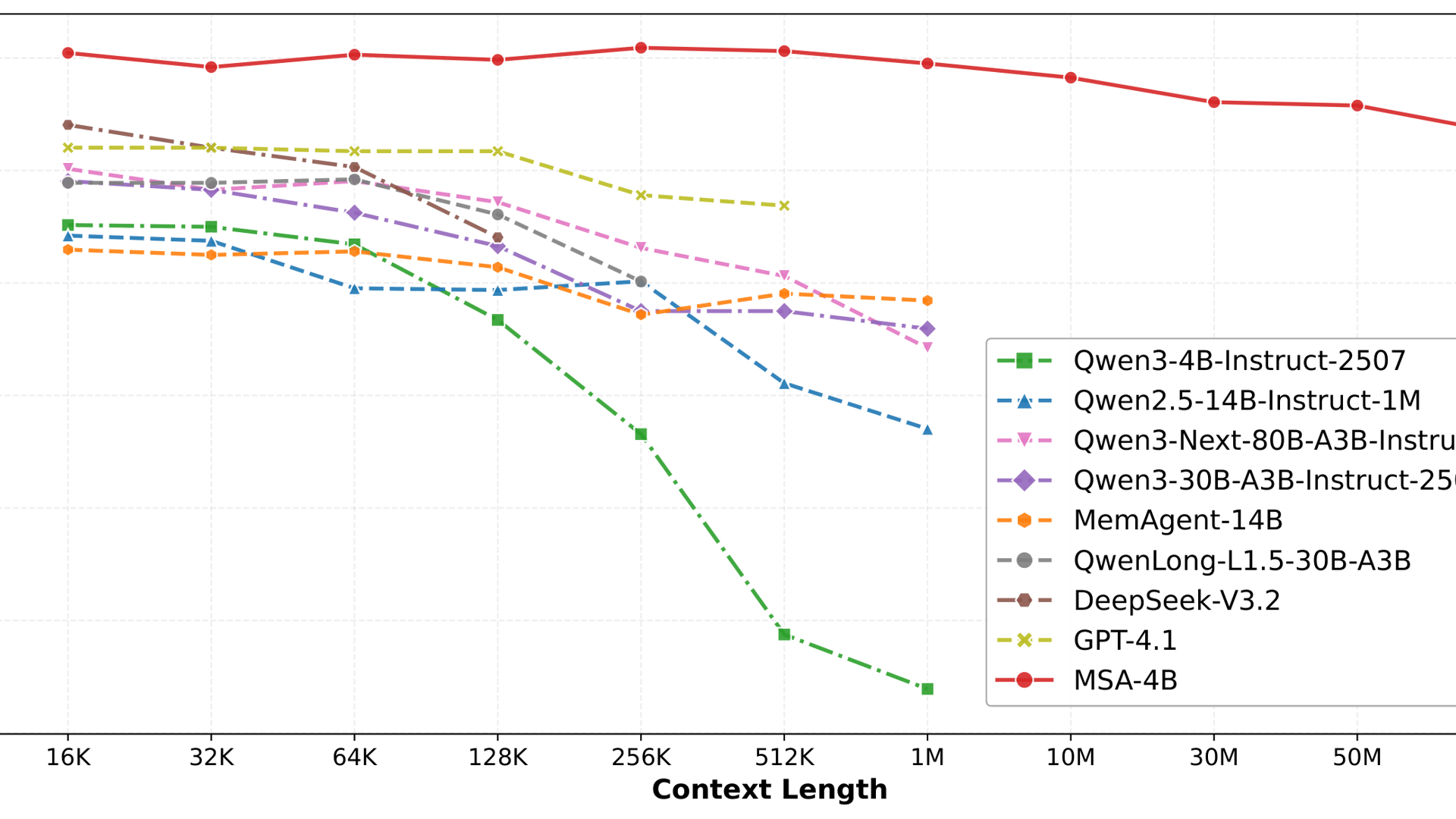 MSA is an end-to-end trainable long-term memory architecture from EverMind that aims to scale LLM context from the usual 128K to 1M-token ceiling up to 100M tokens. According to the paper and model card, it combines sparse attention, document-wise RoPE, KV cache compression, and memory parallelism to keep training and inference complexity linear while preserving most performance at extreme context lengths. EverMind has also released a 4B Qwen3-based model and open-sourced code, but the setup depends on their custom serving/inference stack rather than standard Transformers out of the box.